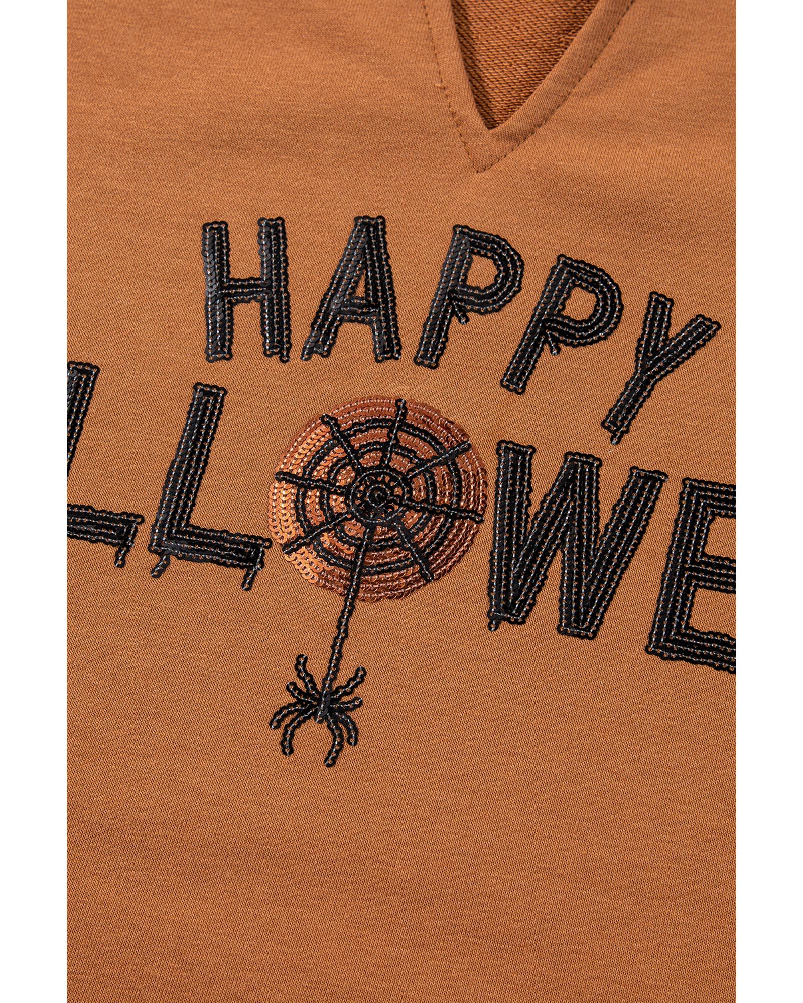 Chestnut Sequin Happy Halloween Graphic Notched Neck Long Sleeve Loose Top – S