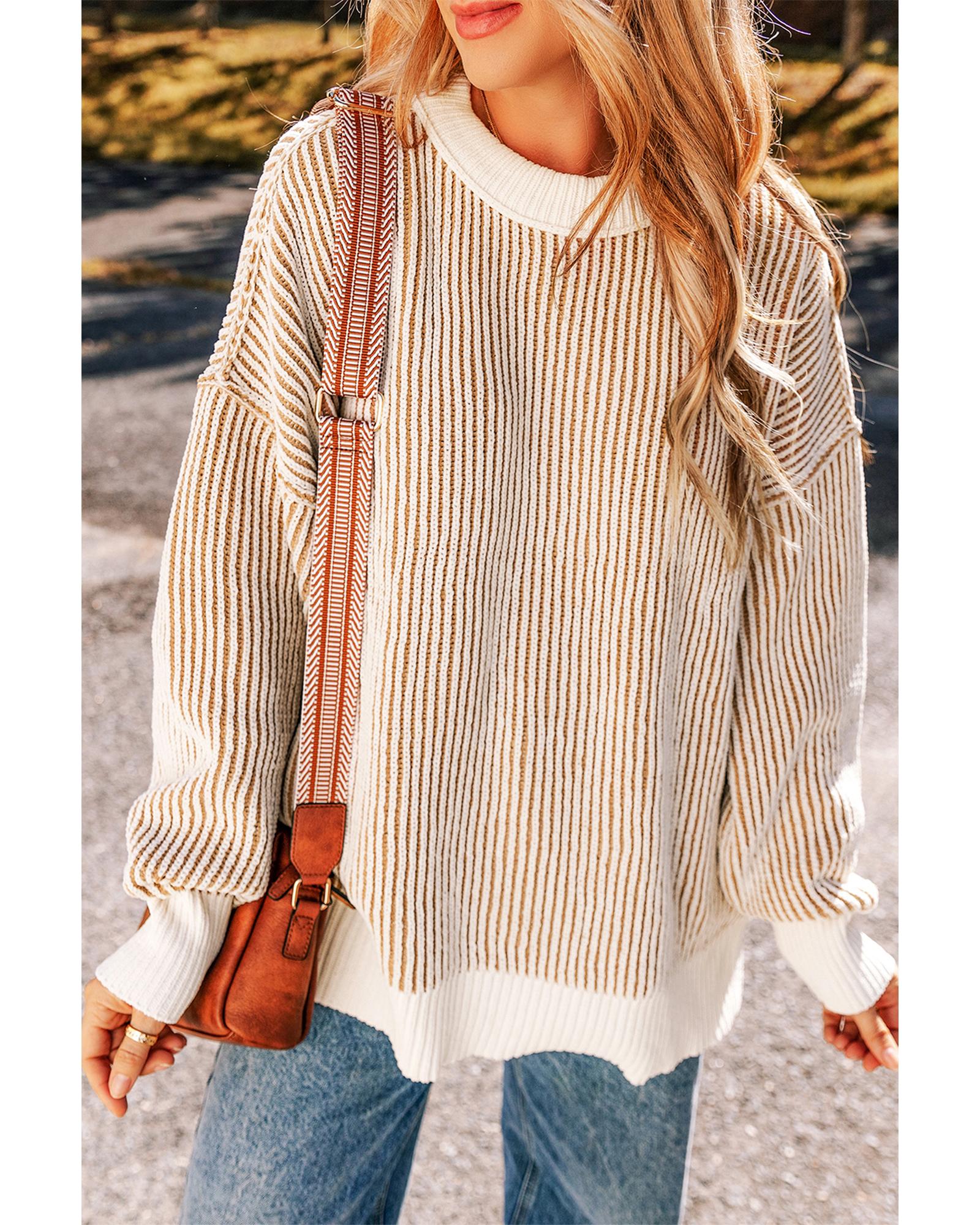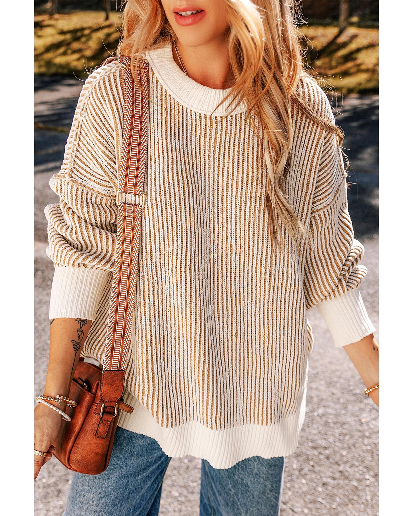 - Chestnut Striped Textured Knit Contrast Edge Loose Sweater