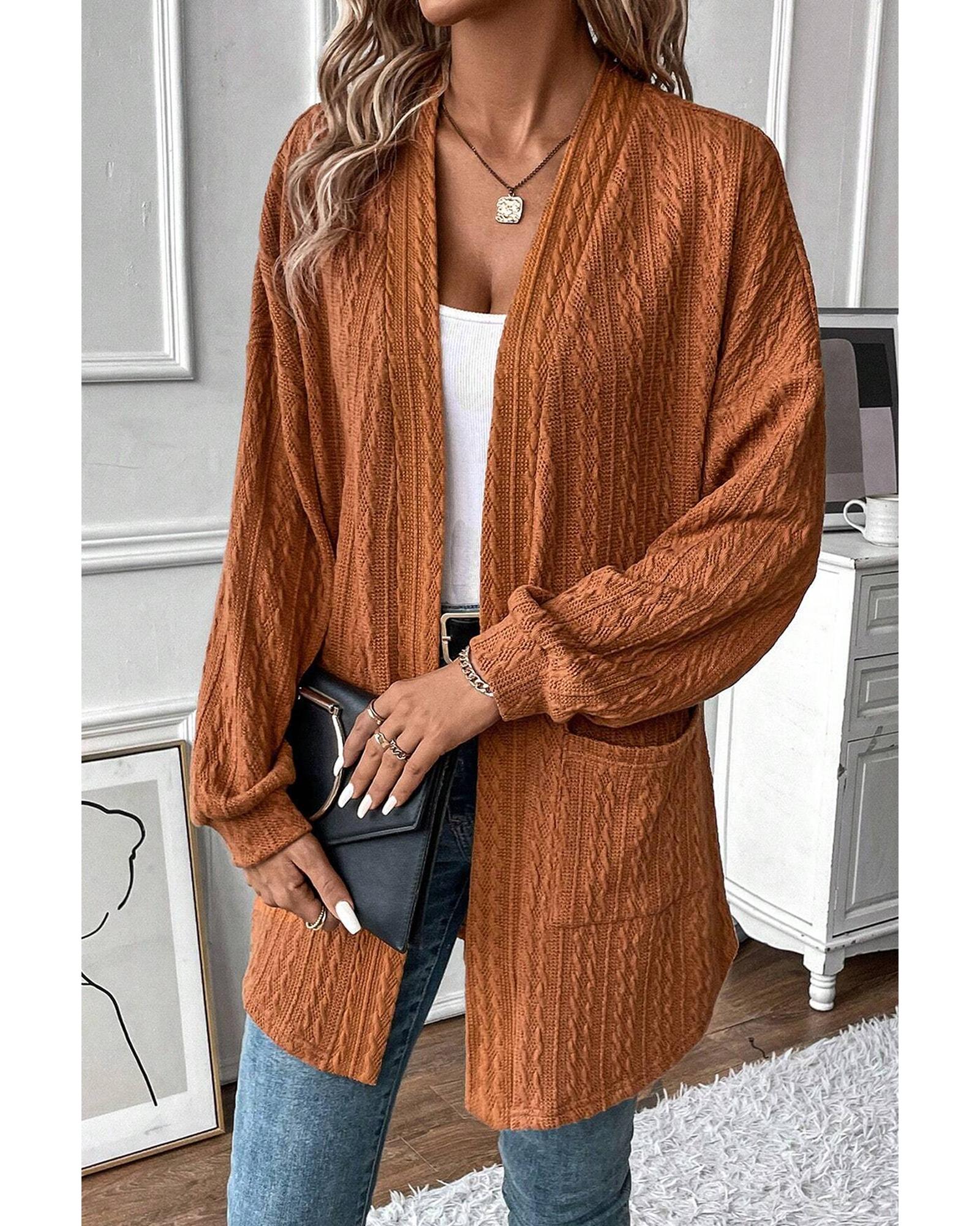 - Chestnut Textured Knit Side Pockets Open Front Cardigan