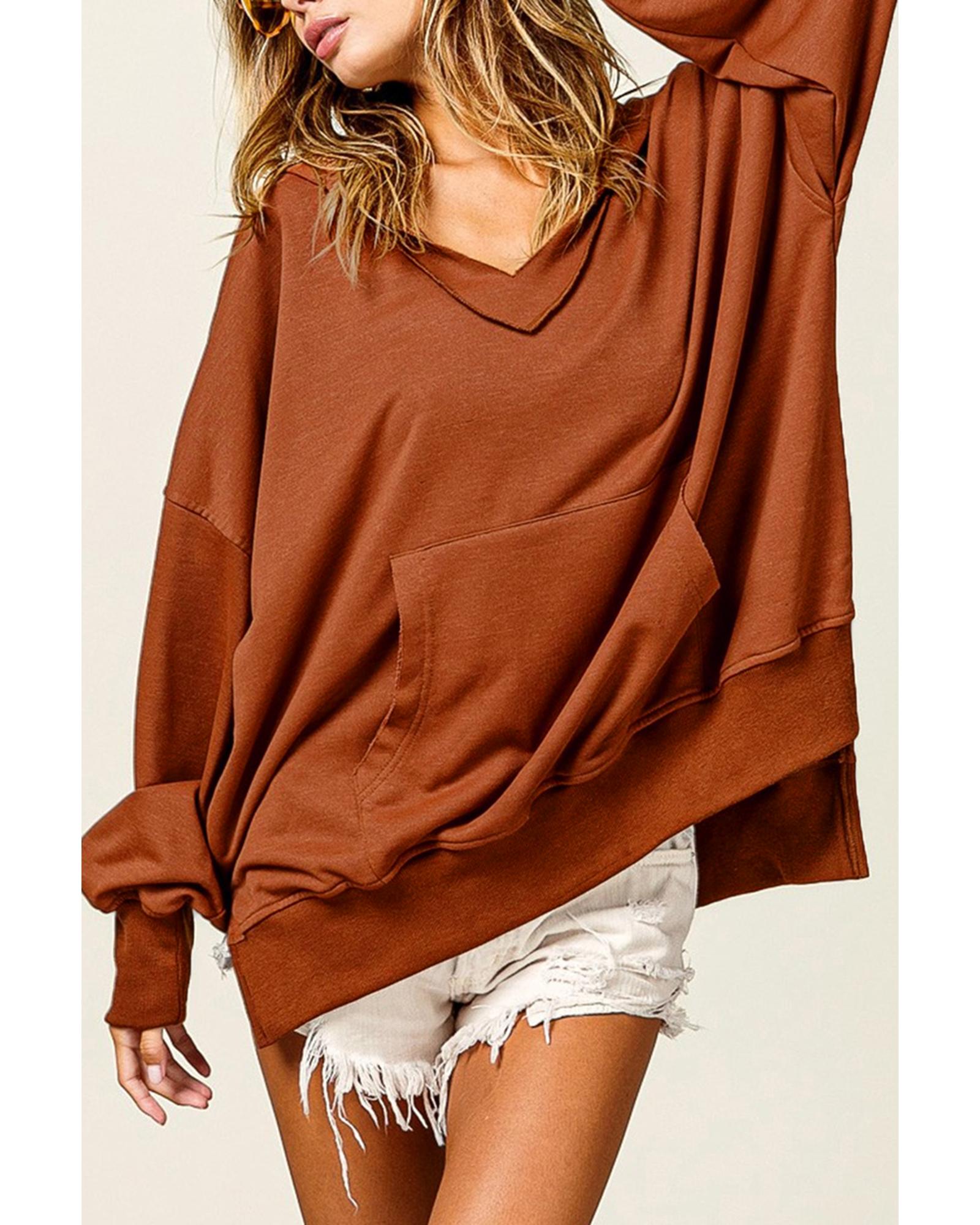 - Chestnut V Neck Kangaroo Pocket Oversized Hoodie