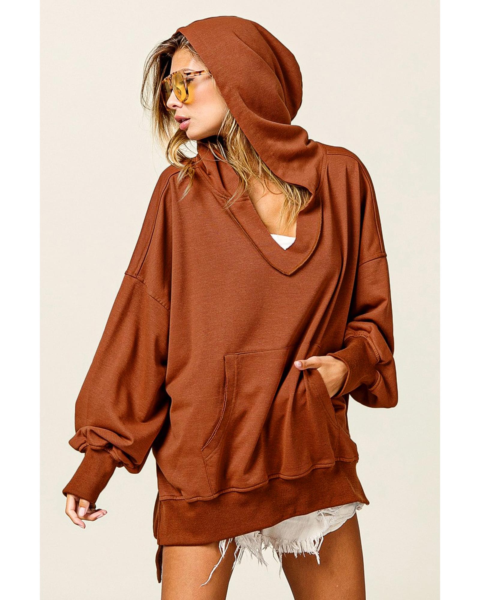 - Chestnut V Neck Kangaroo Pocket Oversized Hoodie