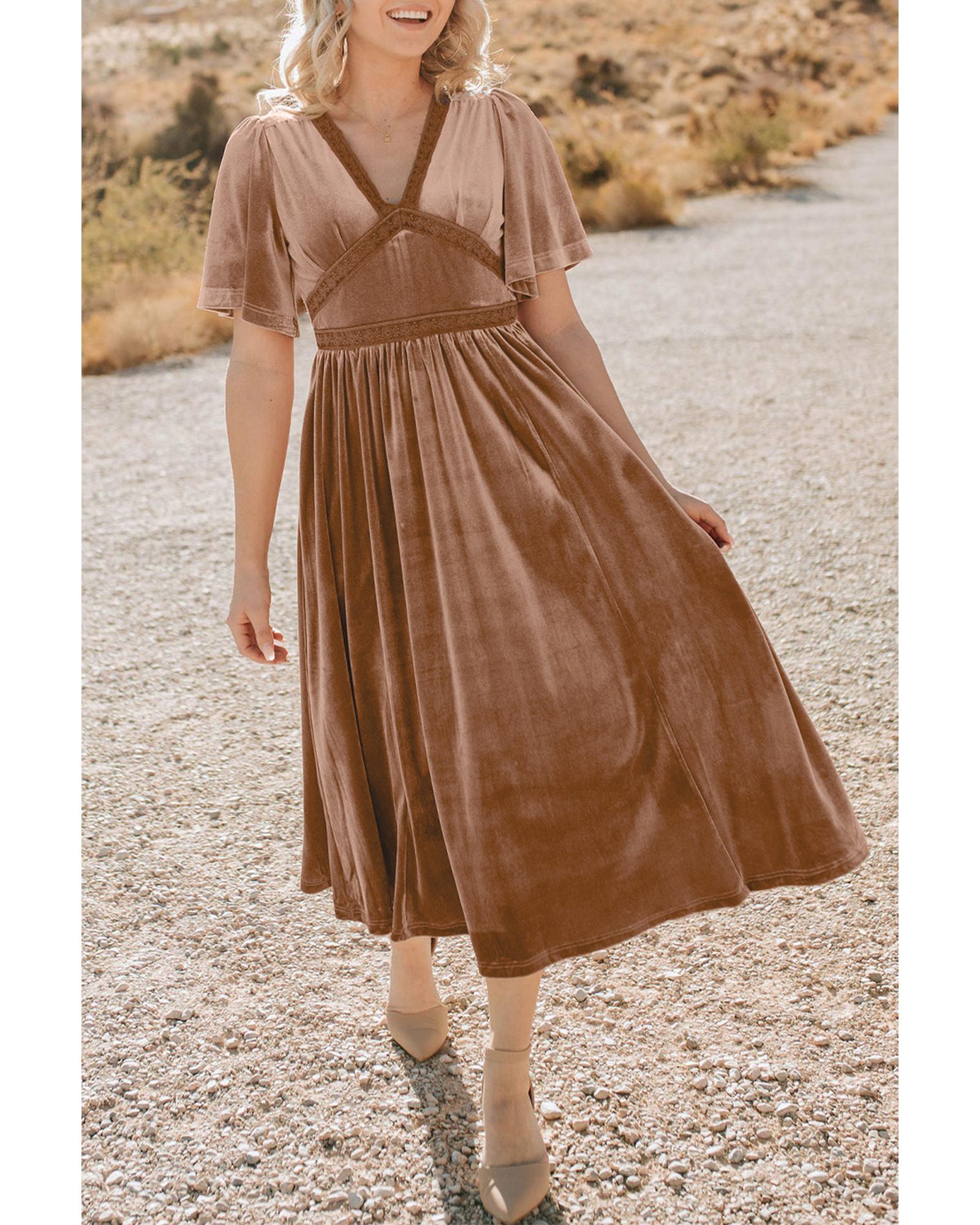 Chestnut Velvet Lacy V Neckline Short Sleeve Empire Waist Flowy Maxi Dress - M