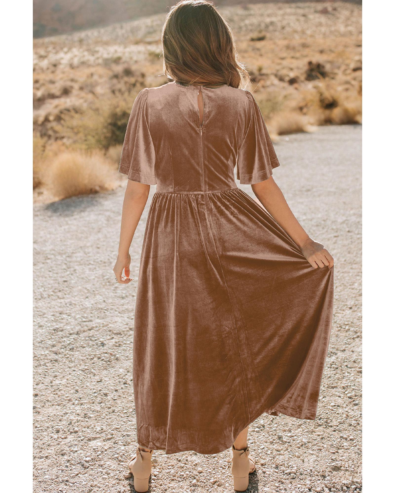 Chestnut Velvet Lacy V Neckline Short Sleeve Empire Waist Flowy Maxi Dress - XL
