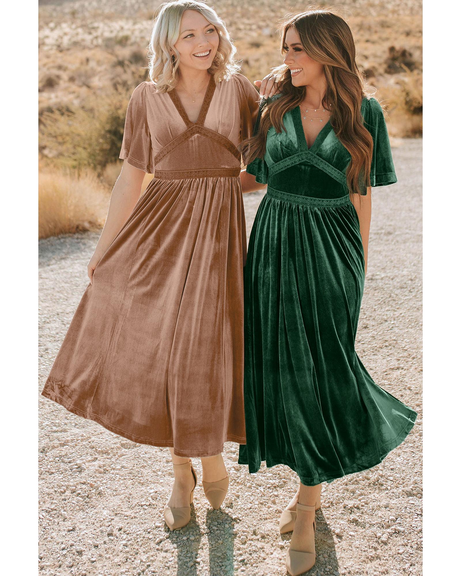 Chestnut Velvet Lacy V Neckline Short Sleeve Empire Waist Flowy Maxi Dress - M