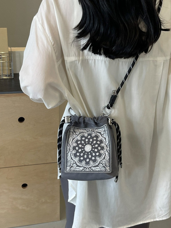 Chic Drawstring Bucket Bag with Intricate Print – Adjustable Rope Strap, Lightweight Fabric(Gray)