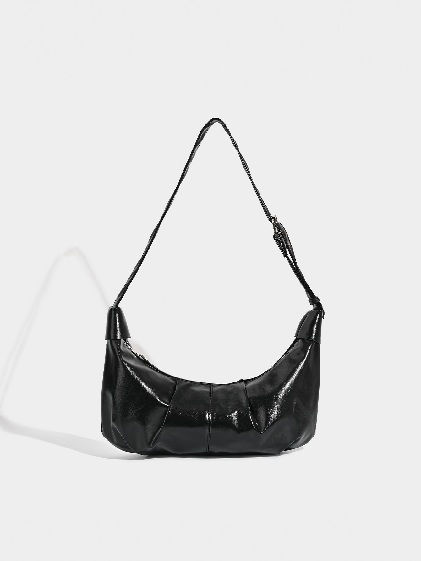 Chic Ruched Faux Leather Bag – Vintage Inspired Croissant Style, Black