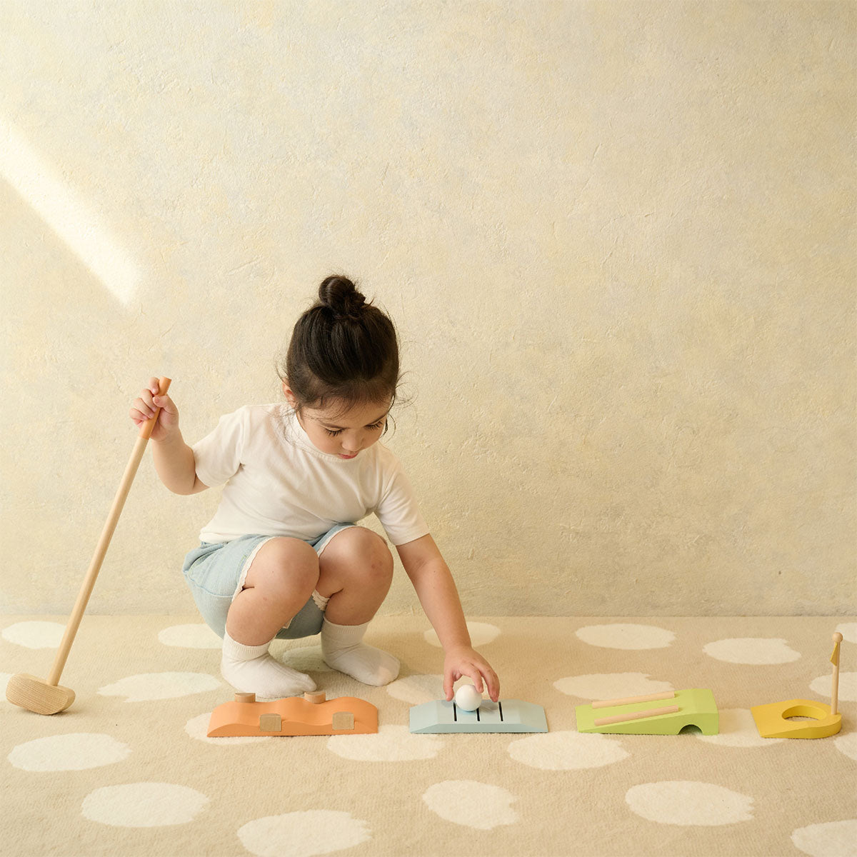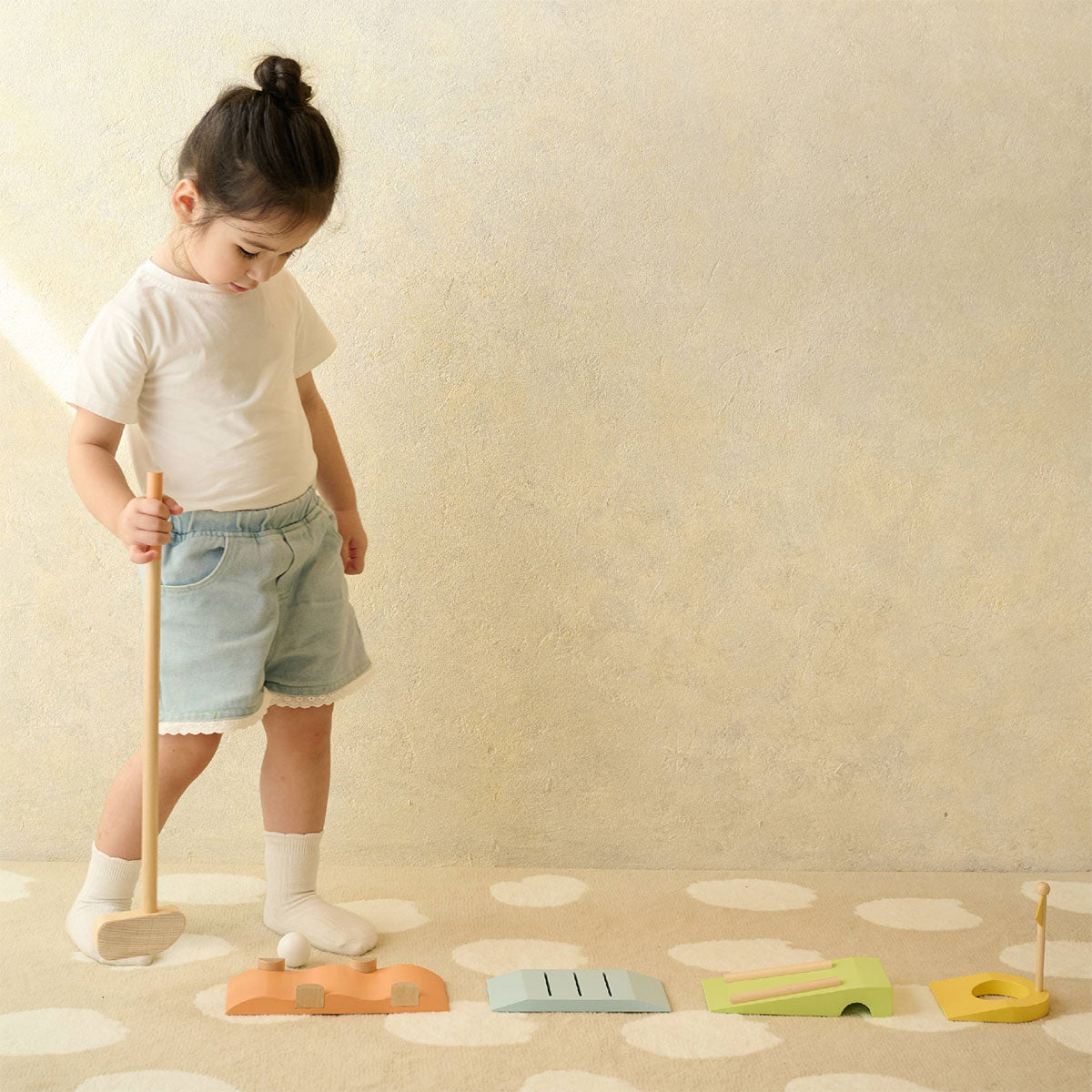 This golf set includes golf clubs, putting cups with flags, balls and 5 unique obstacles. You can set your own golf game. Through exercising, children can improve body coordination and their ability to concentration.