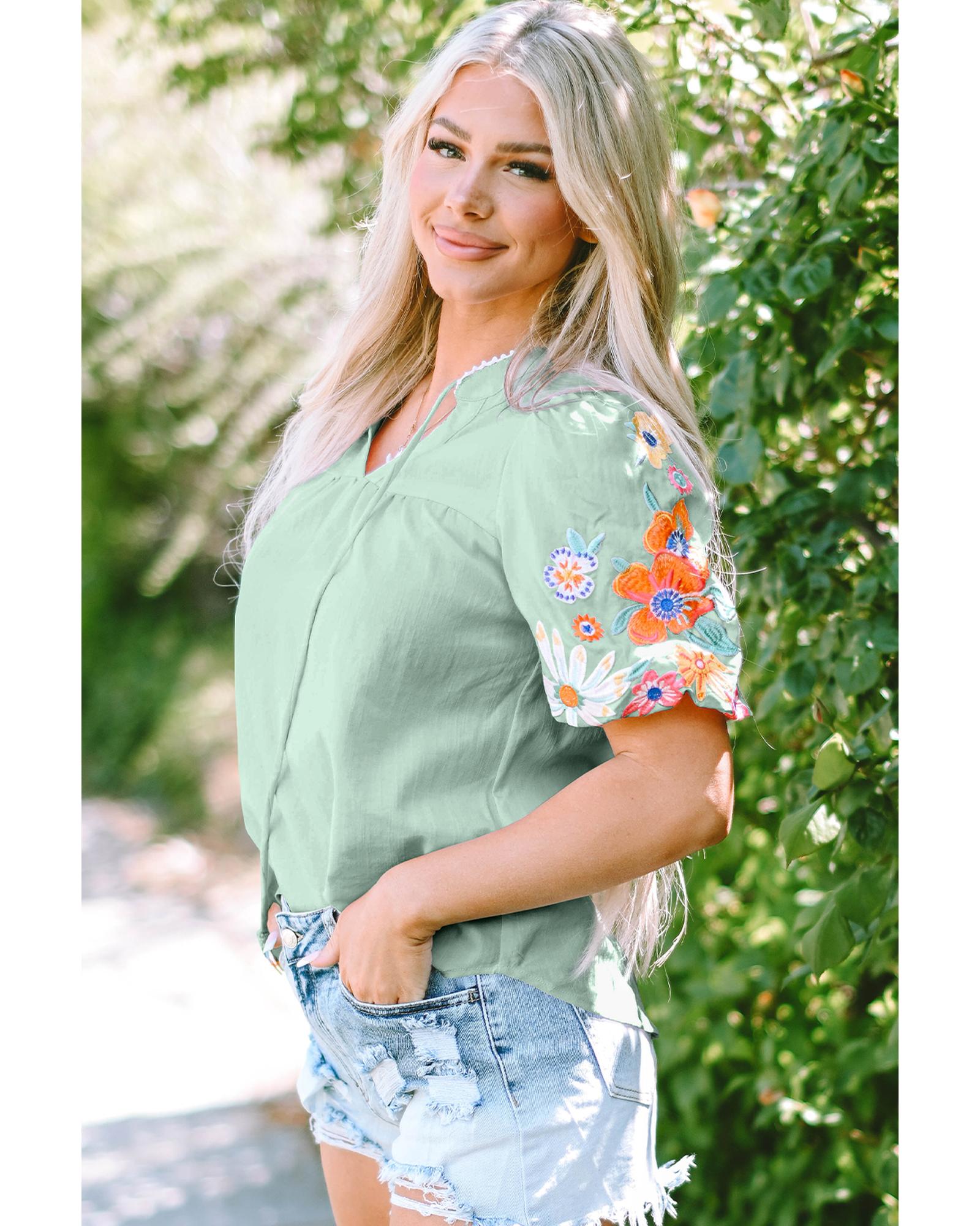 Clearly Aqua Floral Embroidered Puff Sleeve Split Neck Blouse – M