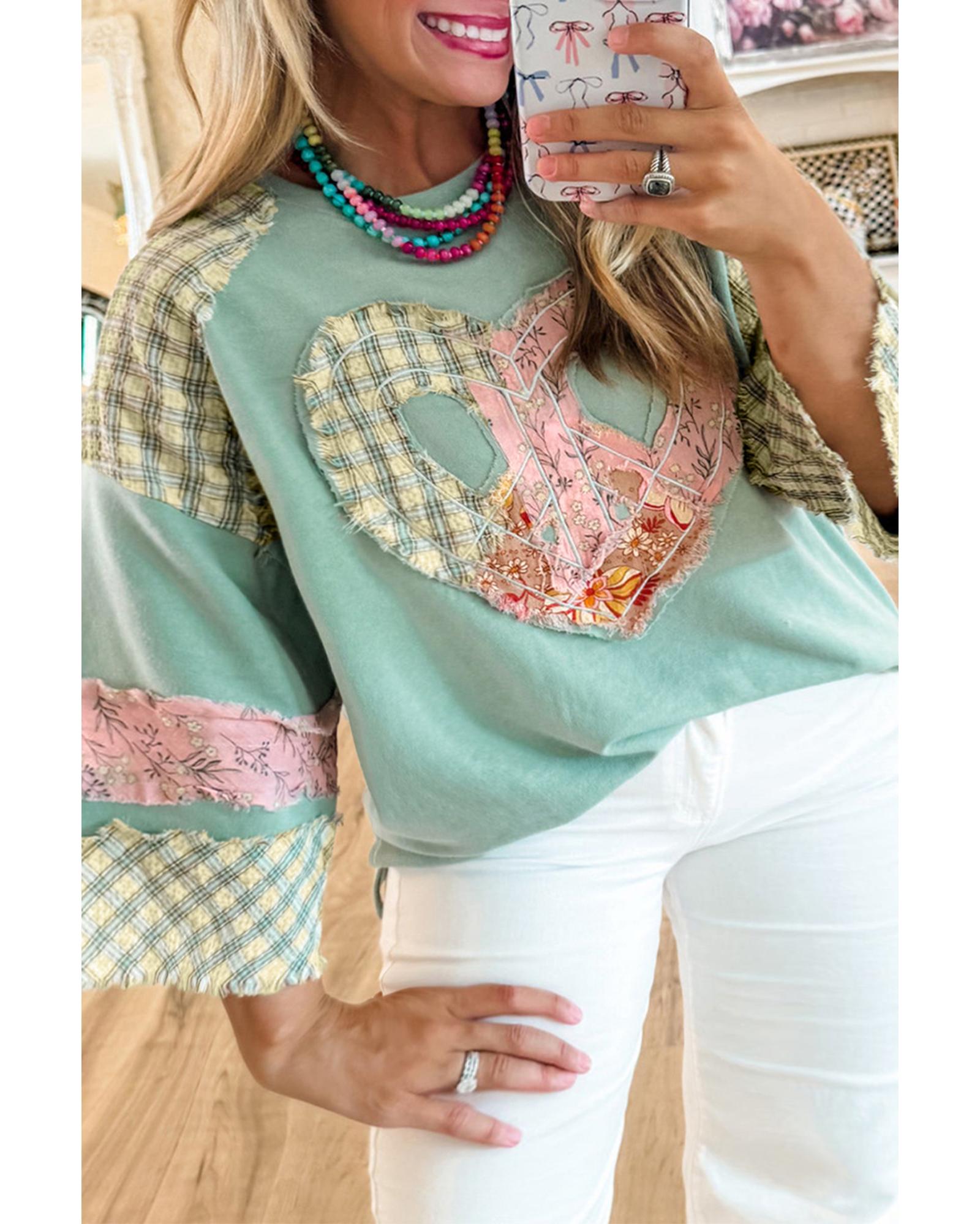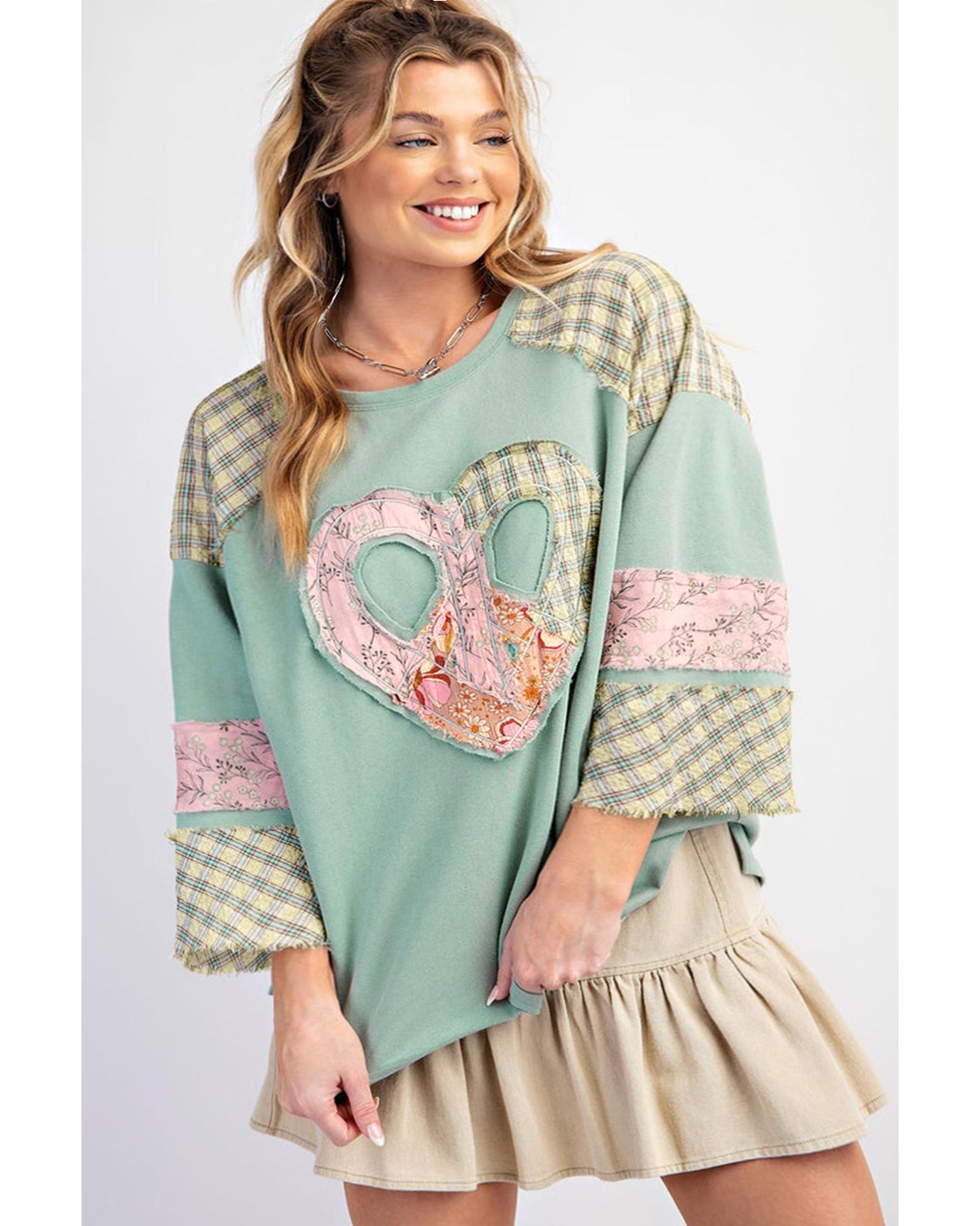 Clearly Aqua Plaid Floral Peace Heart Graphic Wide Long Sleeve Top – XL