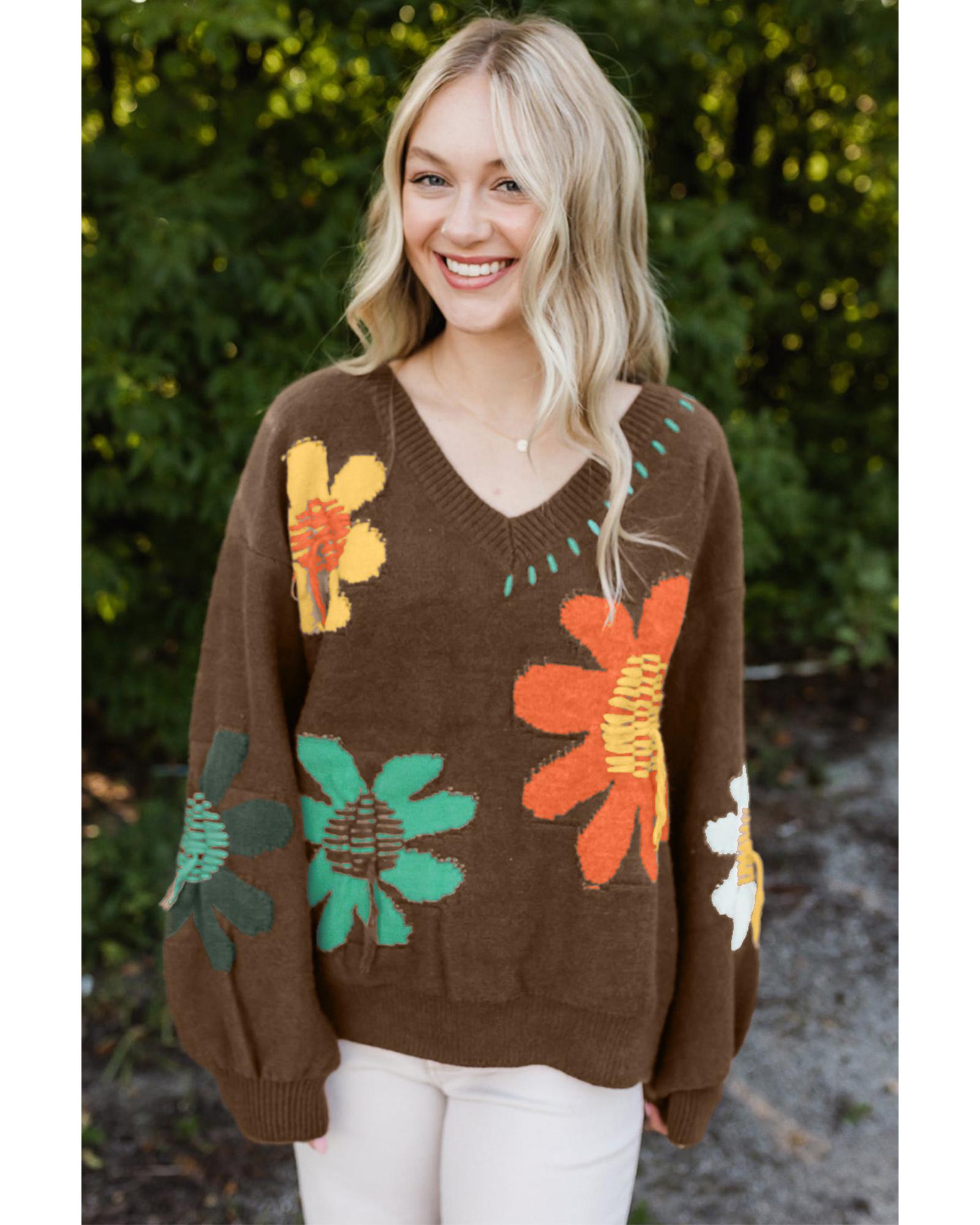 Coffee Big Flower Pattern V Neck Drop Shoulder Sweater – S