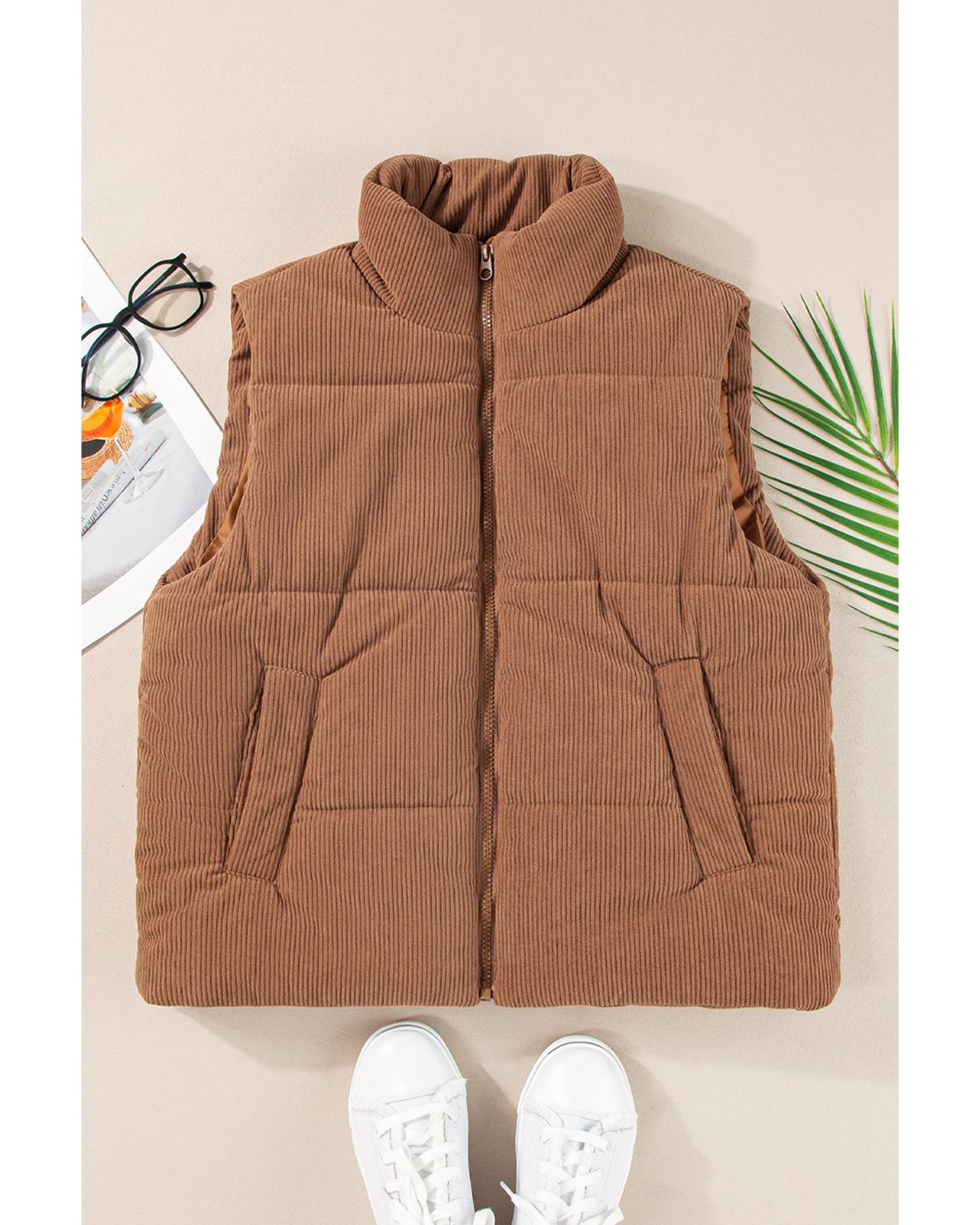 Coffee Corduroy Stand Neck Zipped Puffer Vest – M
