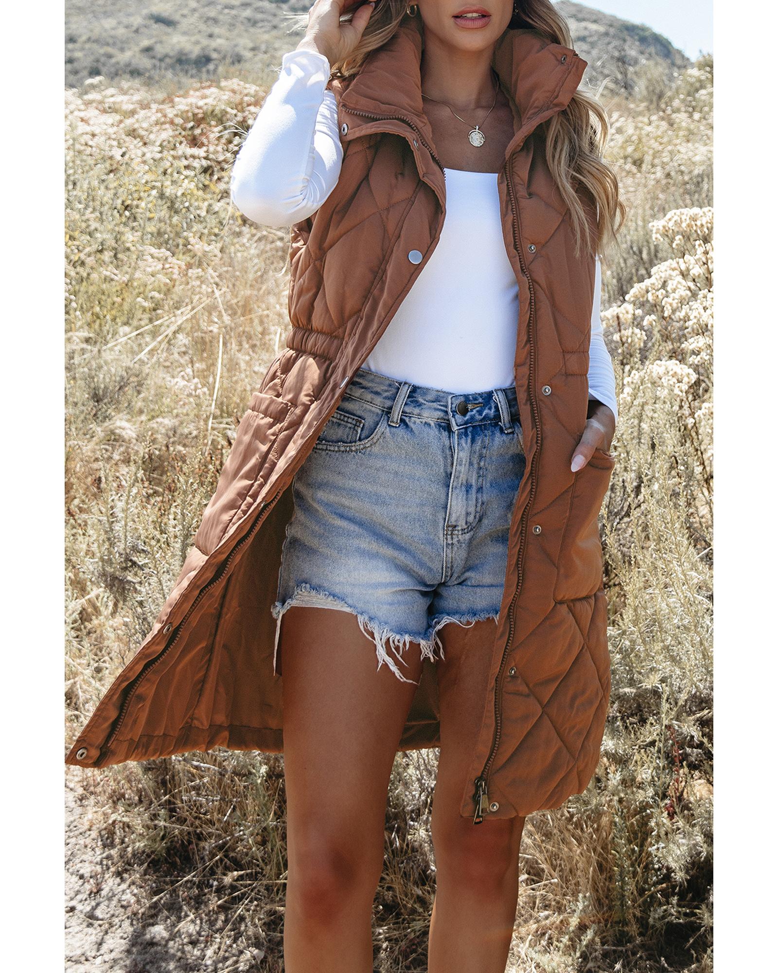 Coffee Longline Quilted Stand Collar Puffer Vest – L