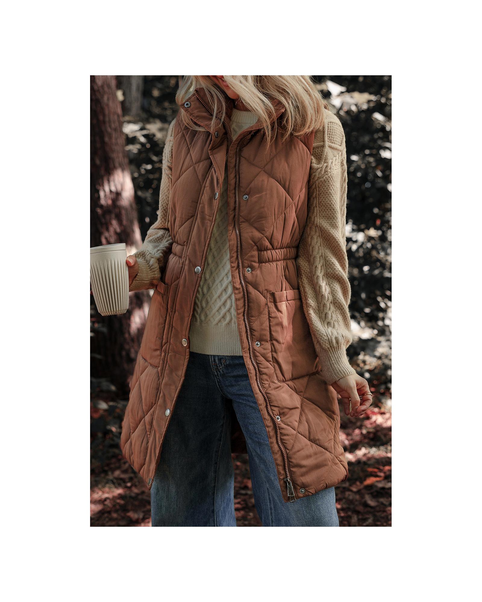 Coffee Longline Quilted Stand Collar Puffer Vest – XL