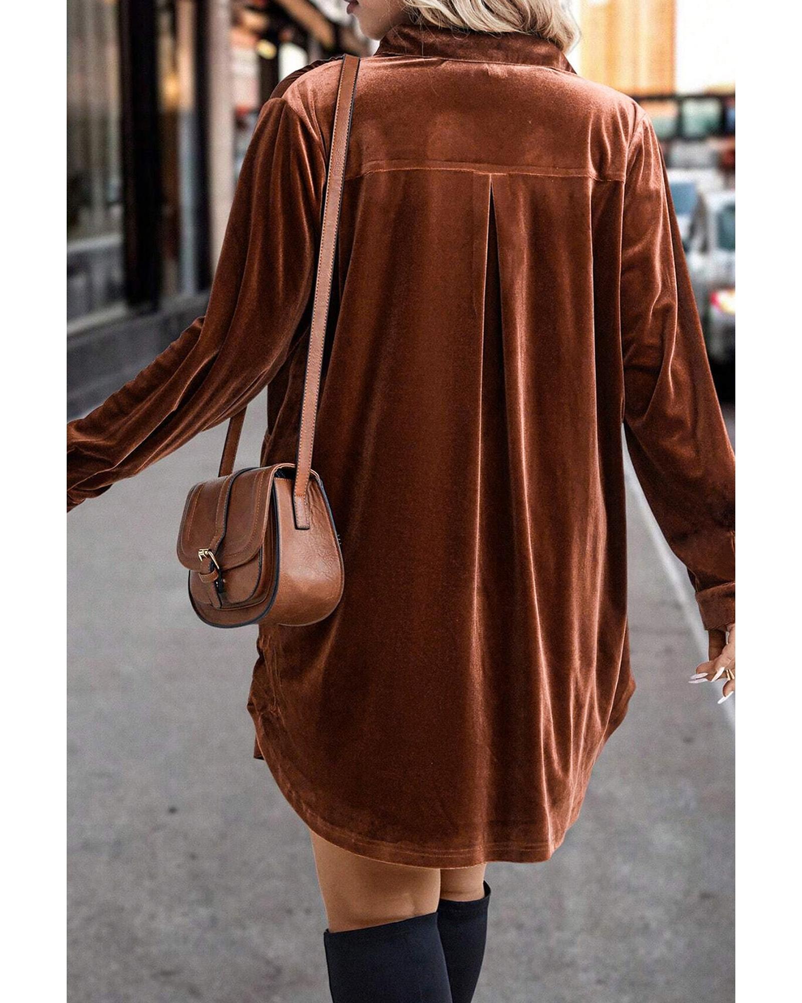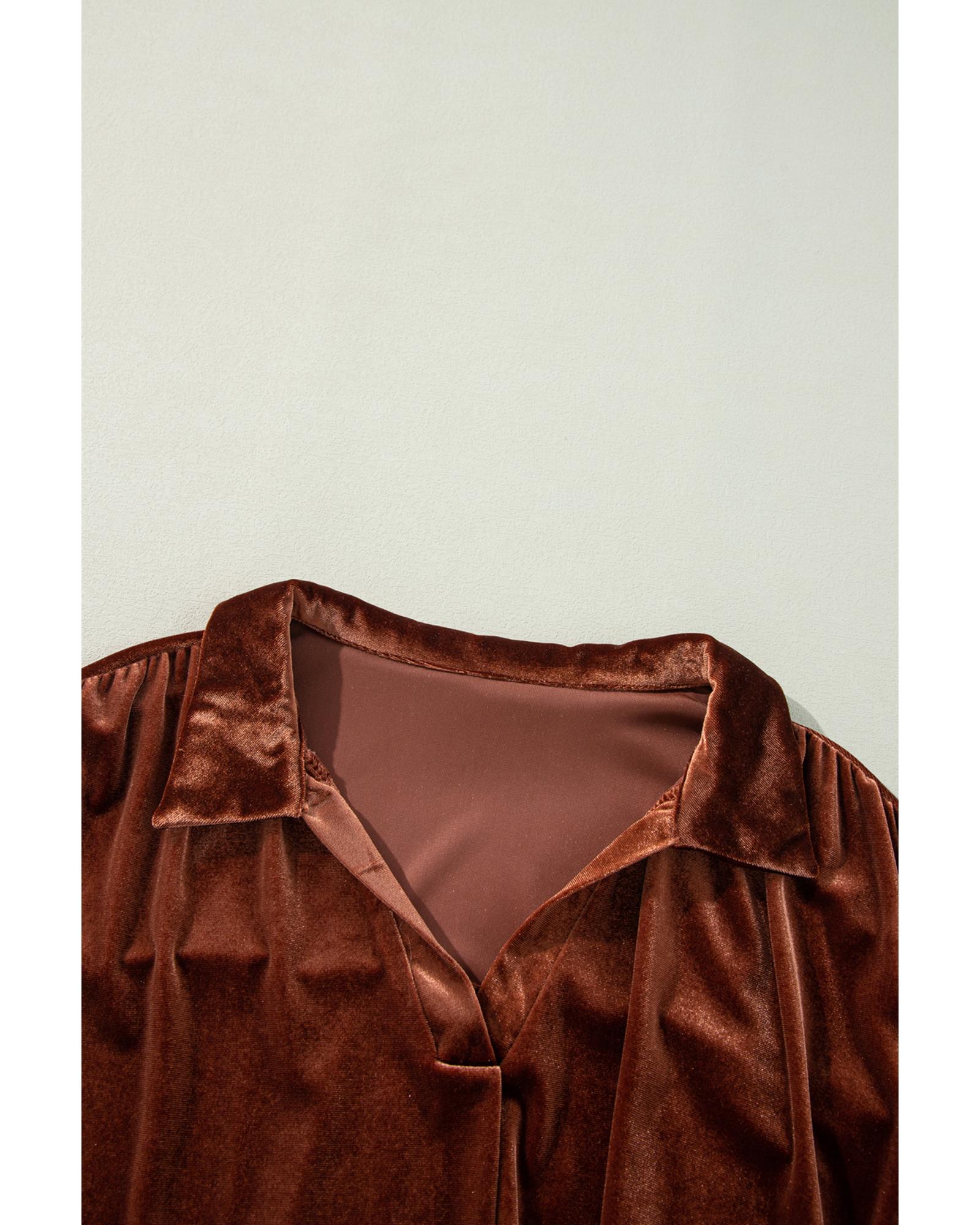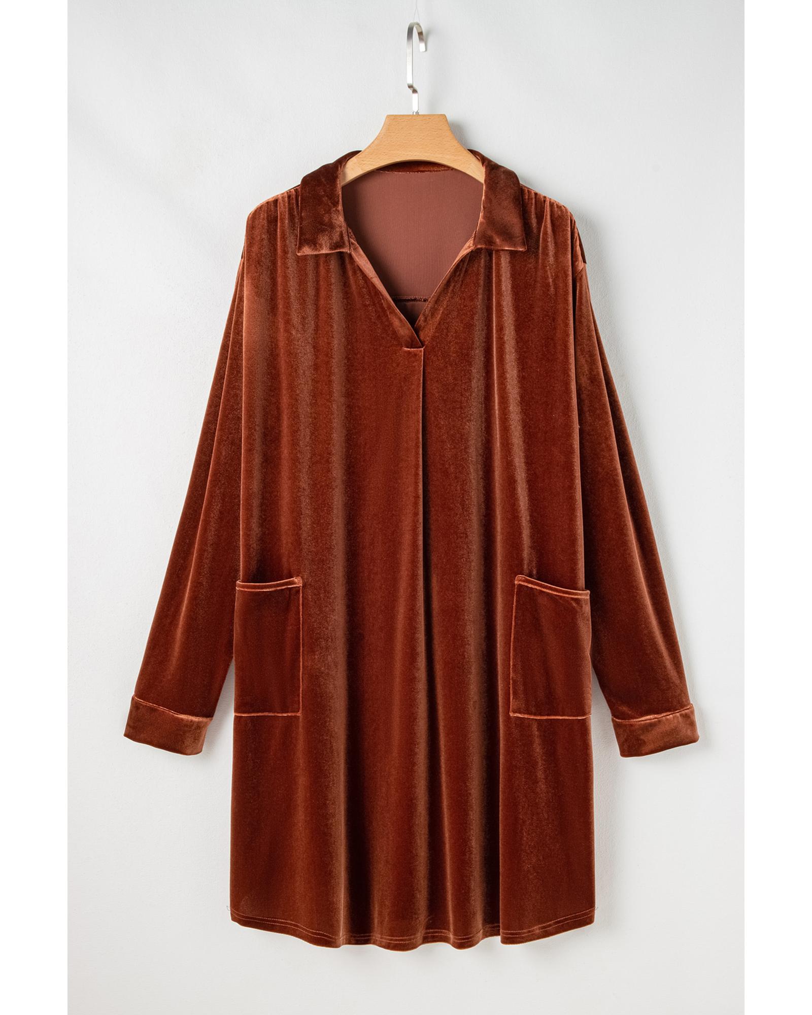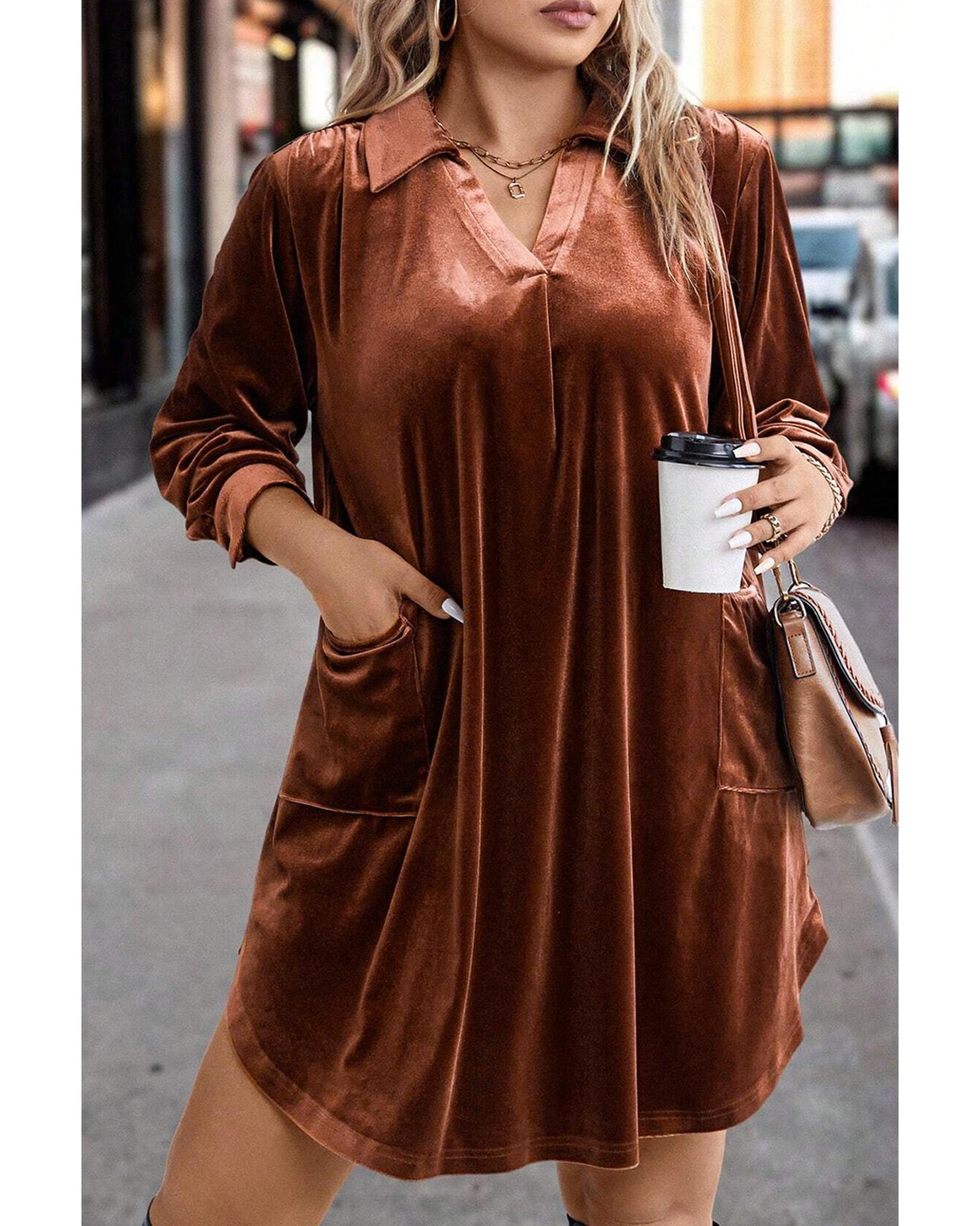 Coffee Plus Size V Neck Collared Pleated Back Rounded Hem Velvet Dress – 3X