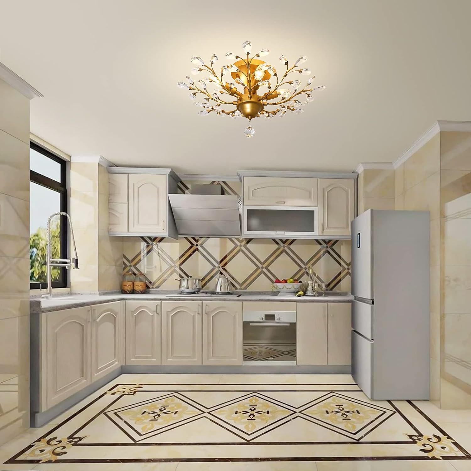 - ELEGANT GLOW: Illuminate your space with this classic gold ceiling light featuring transparent K9 crystals that capture and reflect the light of the bulb. Enjoy a romantic, sweet evening atmosphere with plenty of light and reflection. Easily replace the light bulb to instantly upgrade the look of your home’s ceiling.