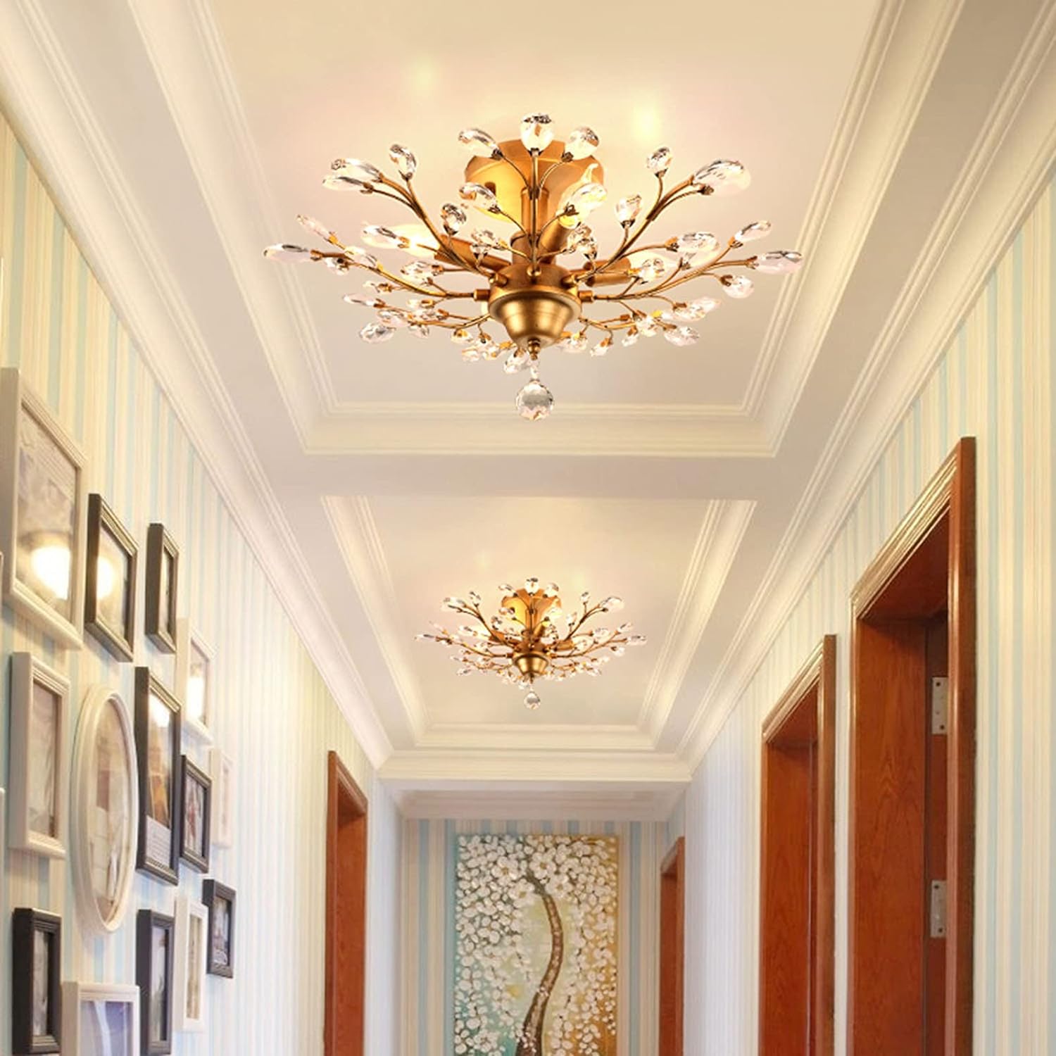 - VERSATILE STYLE: Add a touch of elegance to any room with this stunning crystal ceiling light. Choose from two colors – gold for a classic look or black for a more modern, retro feel – to create the perfect atmosphere in your hallway, bedroom, living room, dining room, kitchen, bar, hotel, balcony, stairwell, children’s room, or any other small space. This eye-catching light will be sure to draw attention to your well-appointed space.
