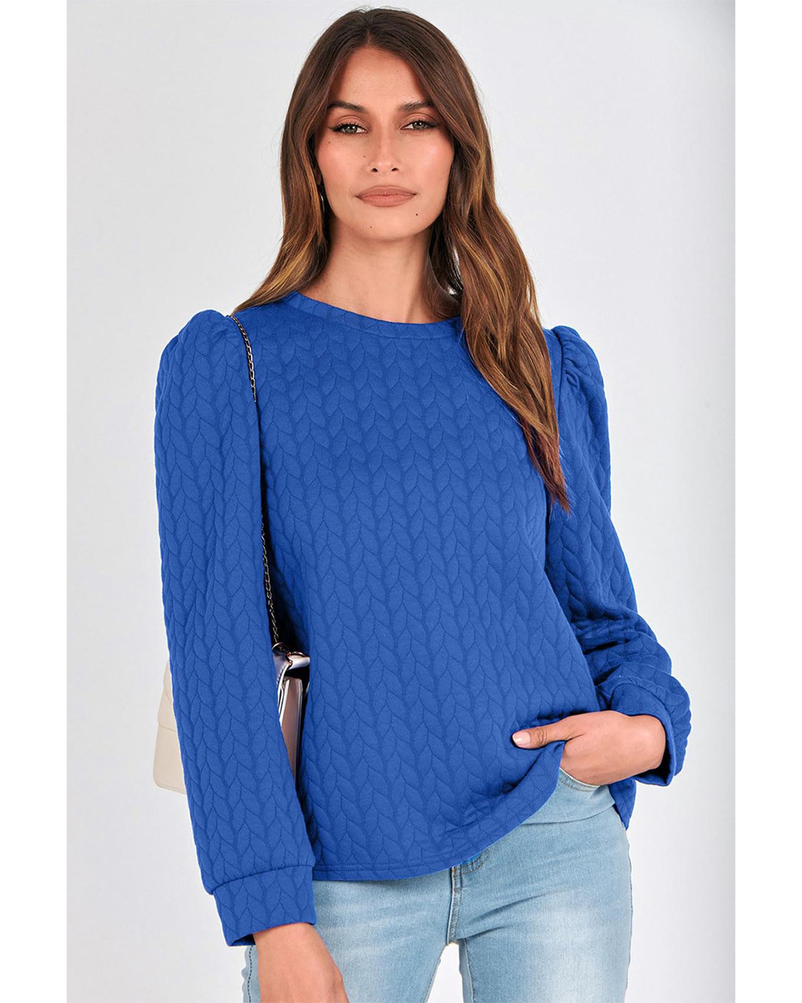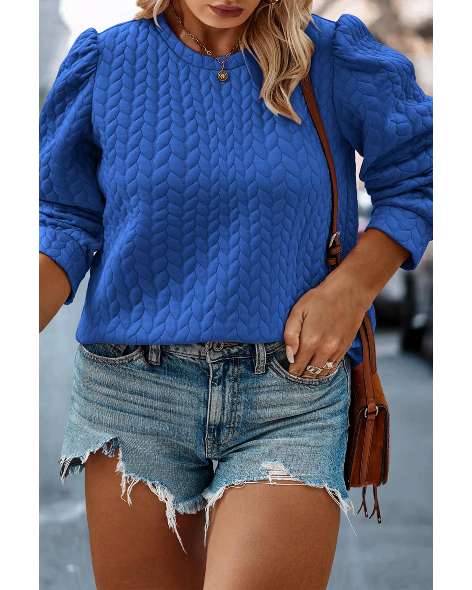 Dark Blue Cable Pattern Puff Sleeve Plus Size Top – 2X