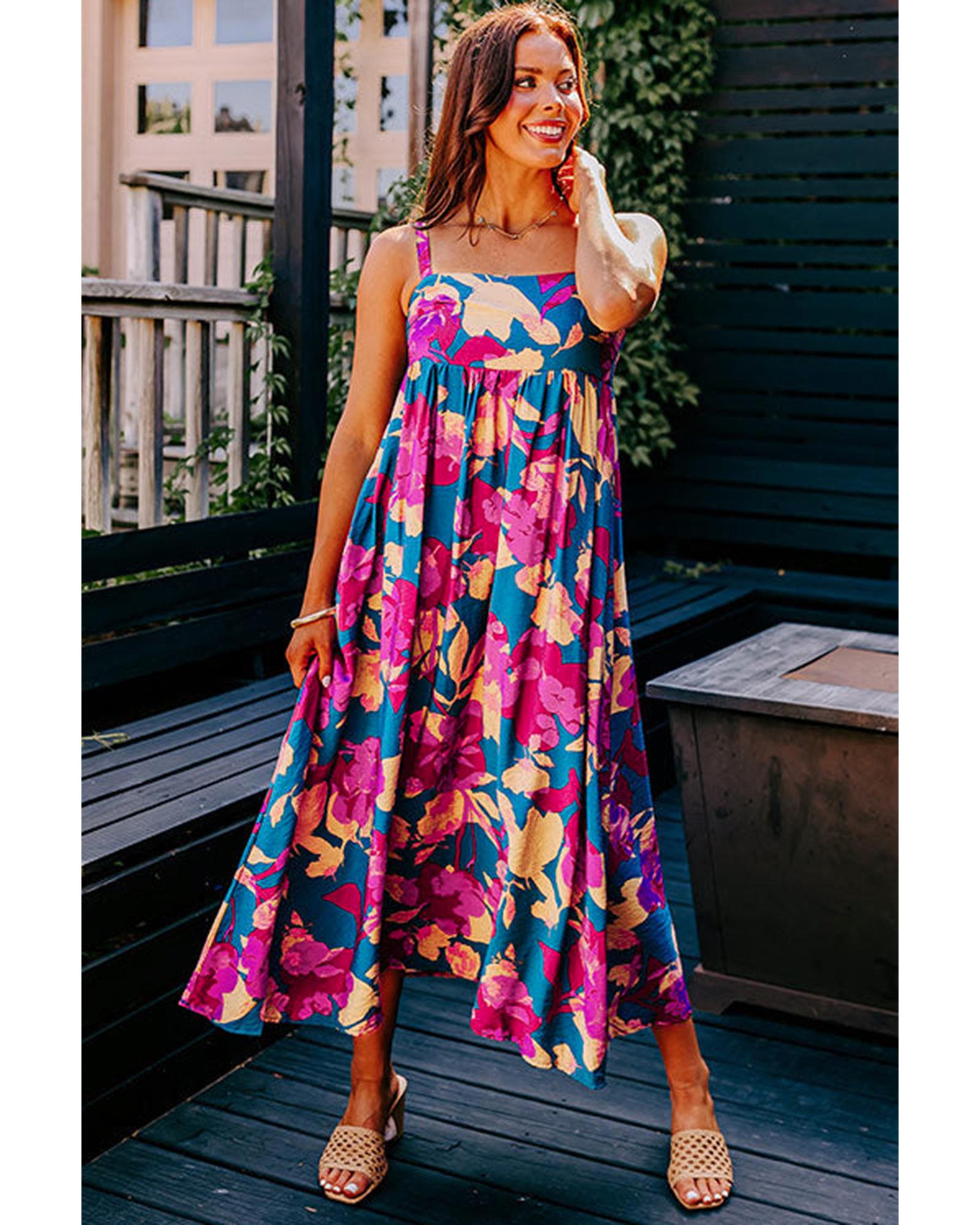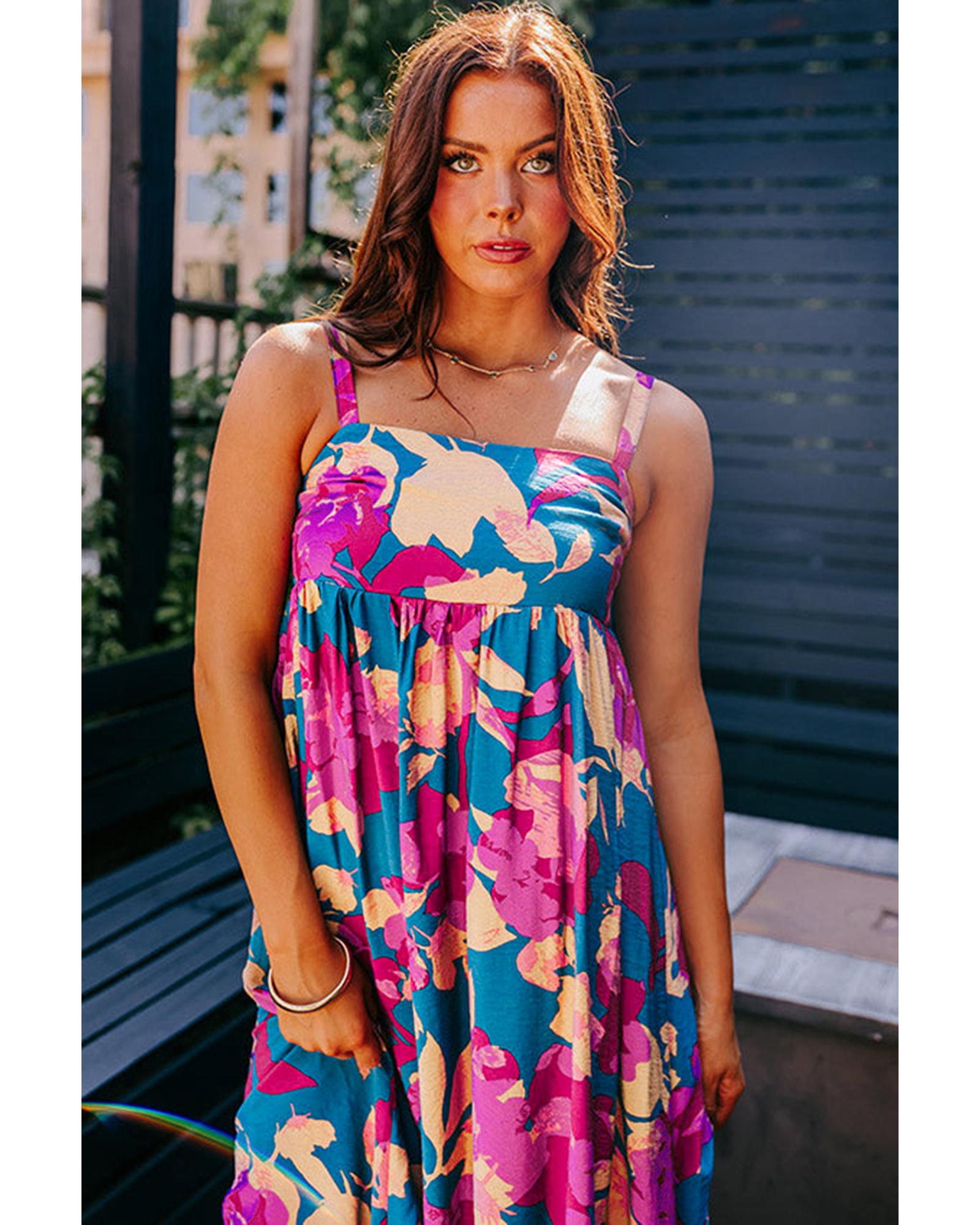 Dark Blue Floral High Waist Sleeveless Flared Long Dress - M