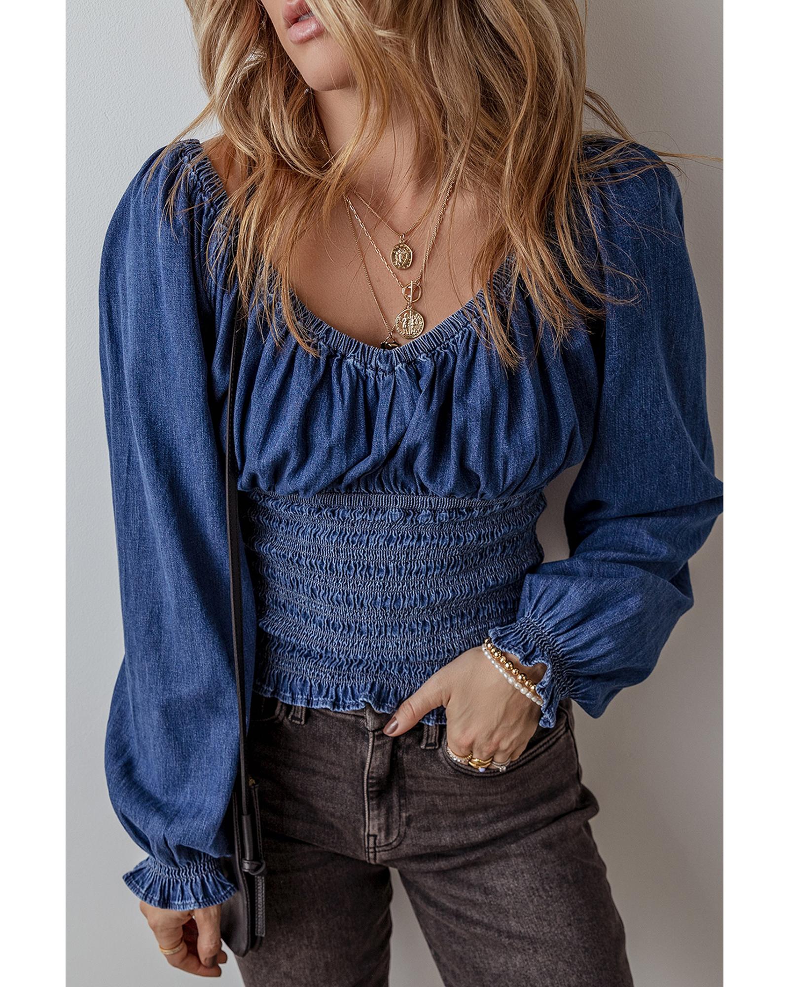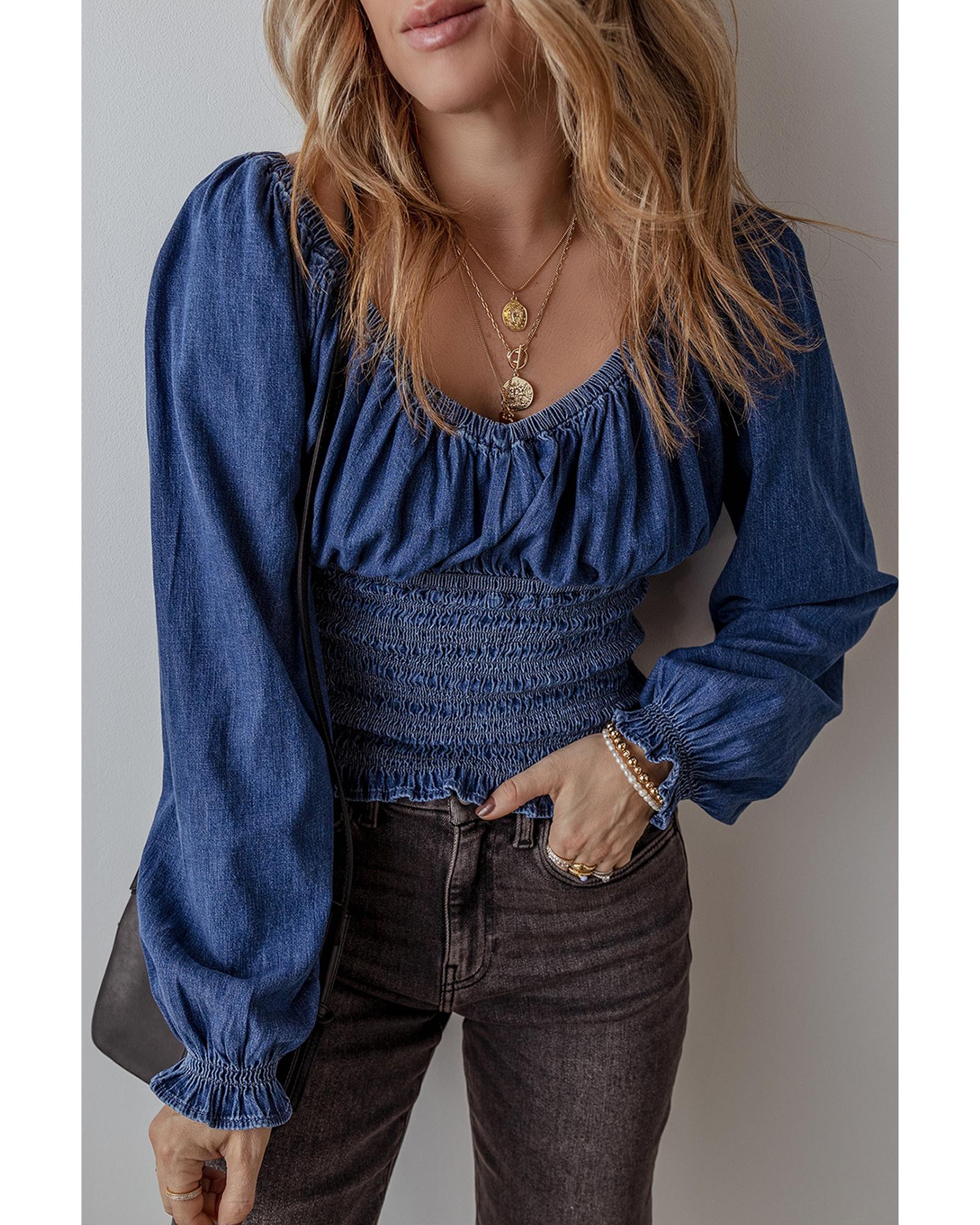 Dark Blue Smocked Ruffled Puff Sleeve V Neck Denim Blouse – M