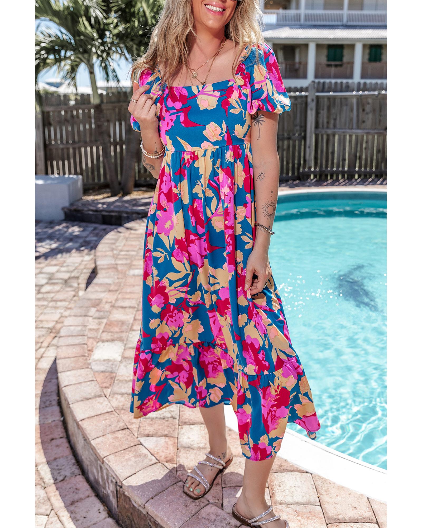 Dark Blue Square Neck Bubble Sleeve Ruffled Floral Dress - S