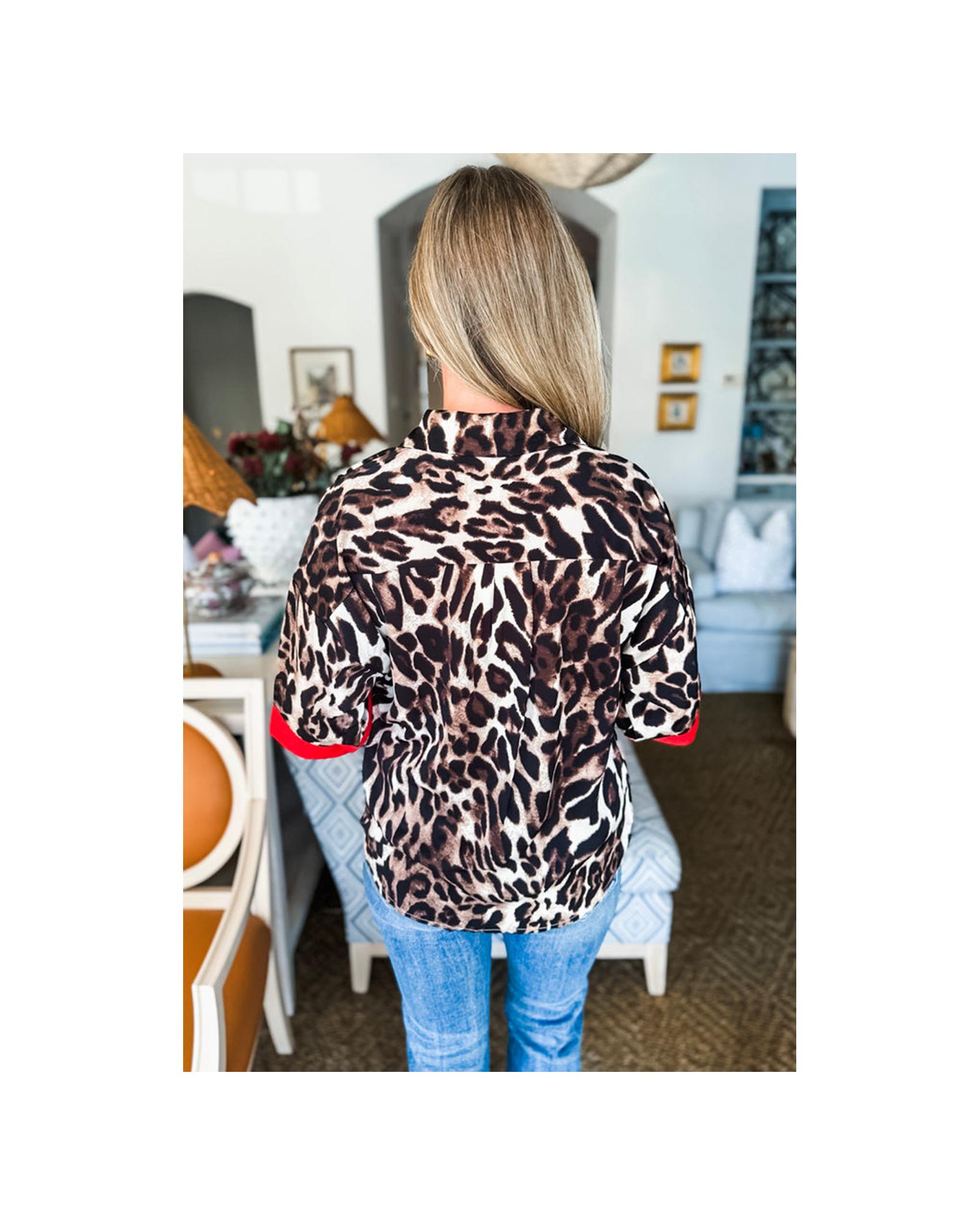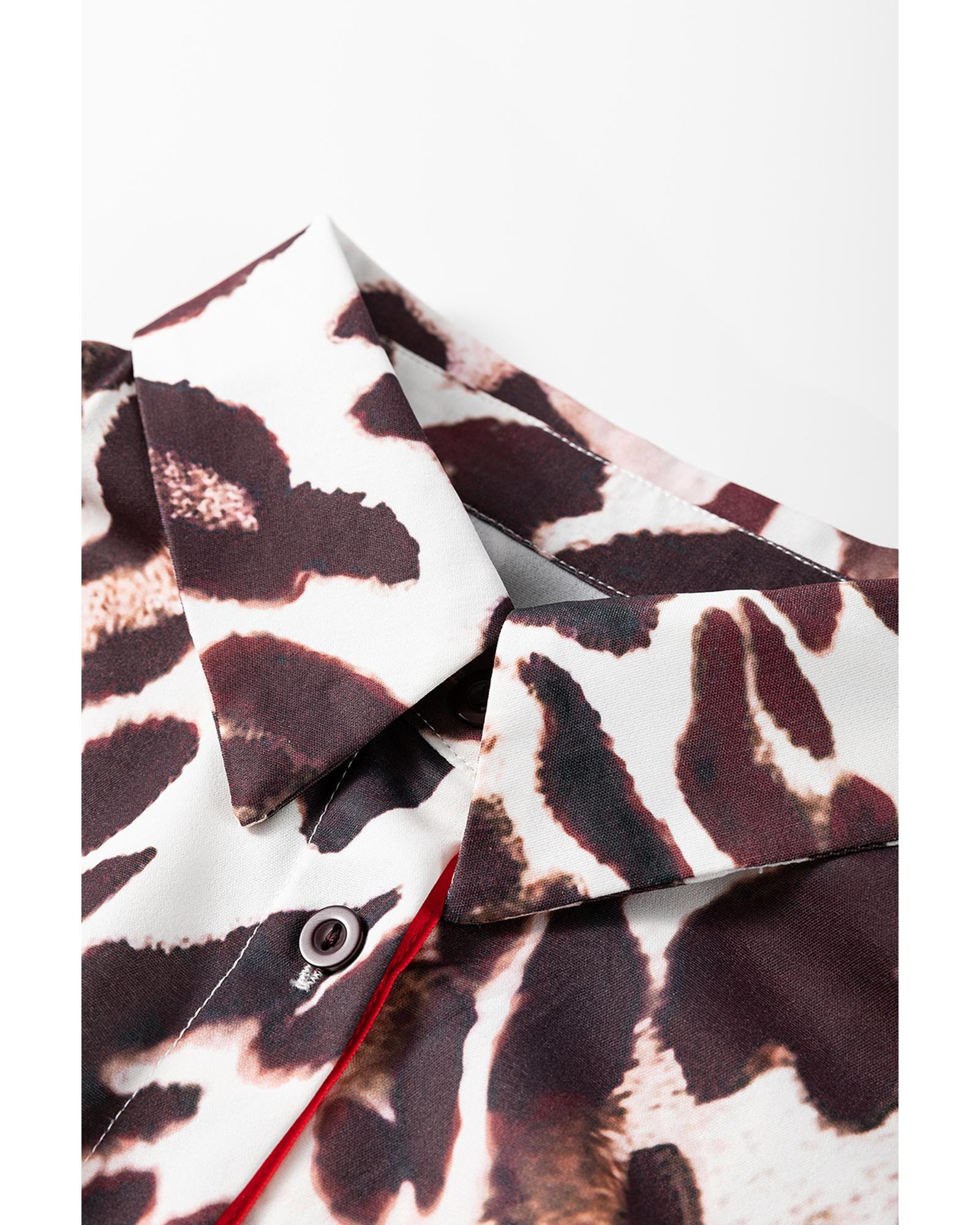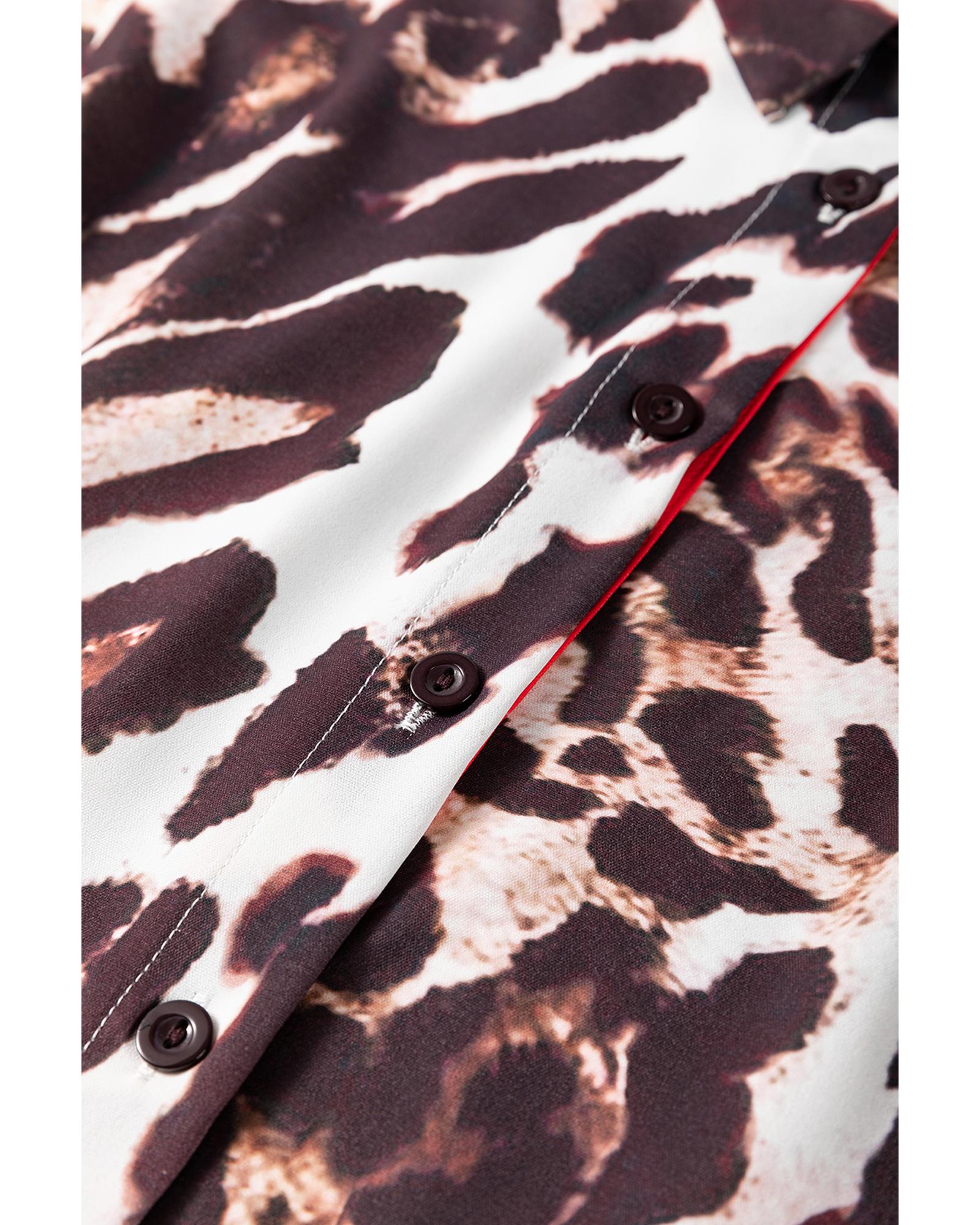 Dark Brown Contrast Trim Patchwork Leopard Print Half Sleeve Shirt – XL
