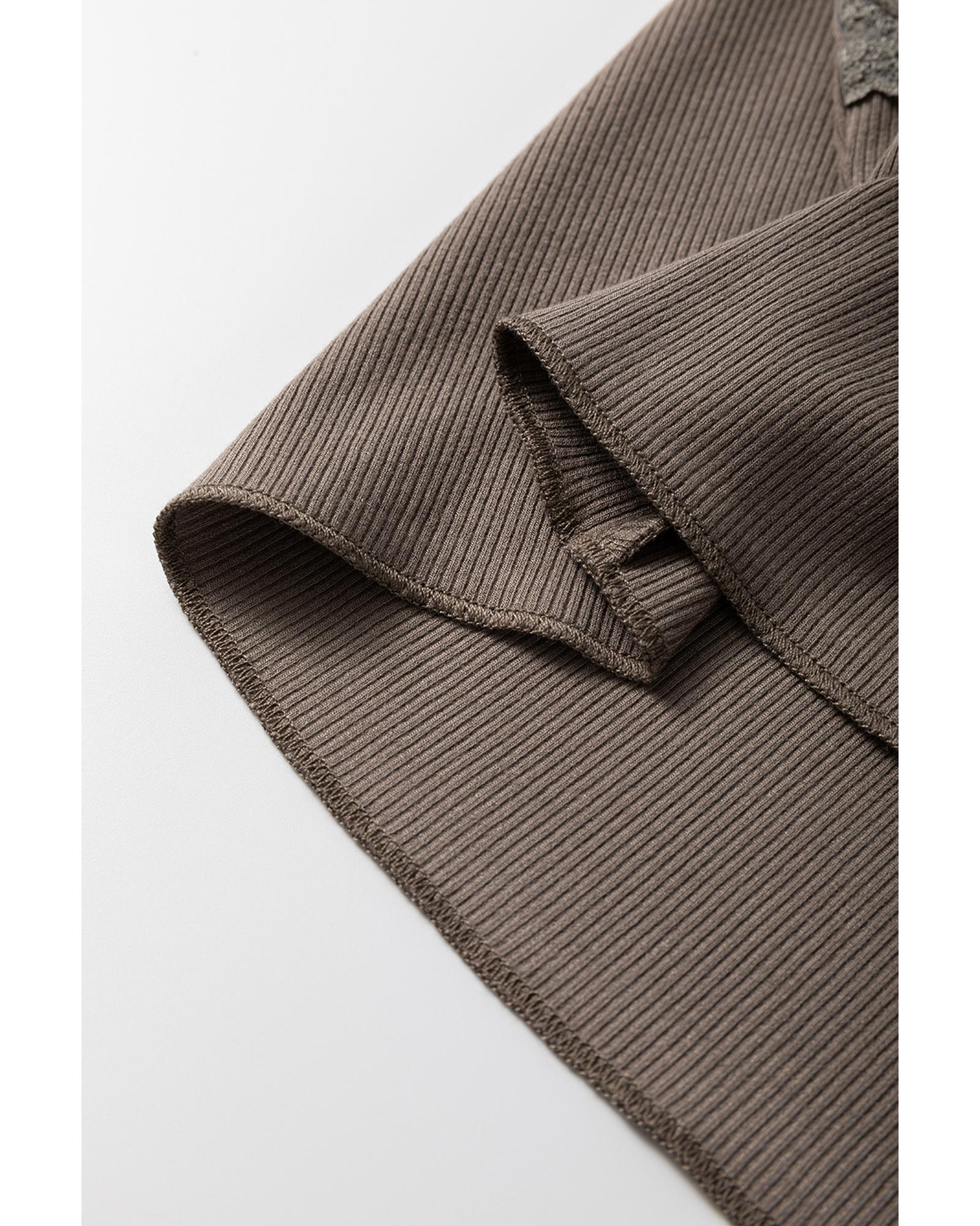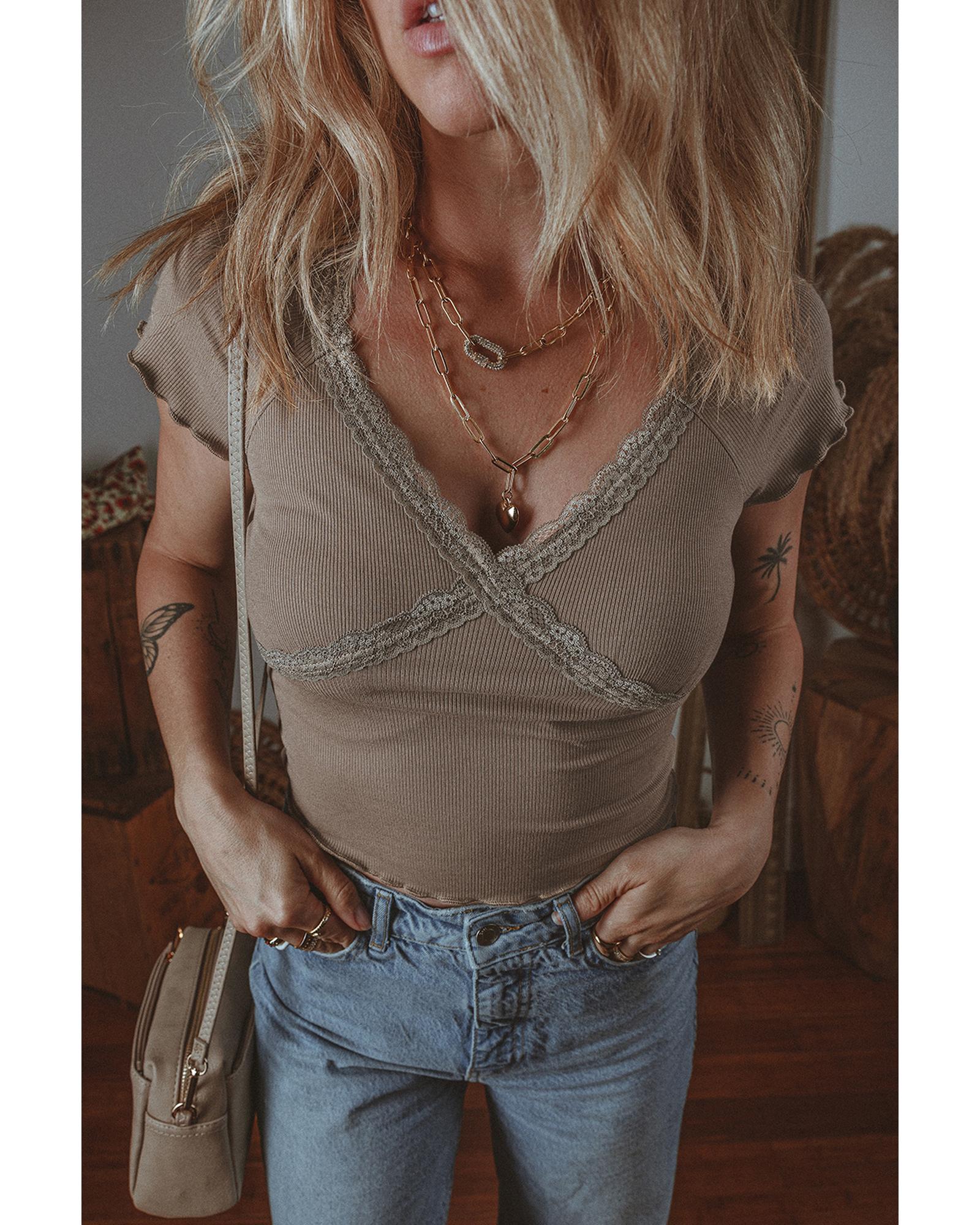 Dark Brown Lace Splicing Criss Cross Slim Fit V Neck T Shirt – M
