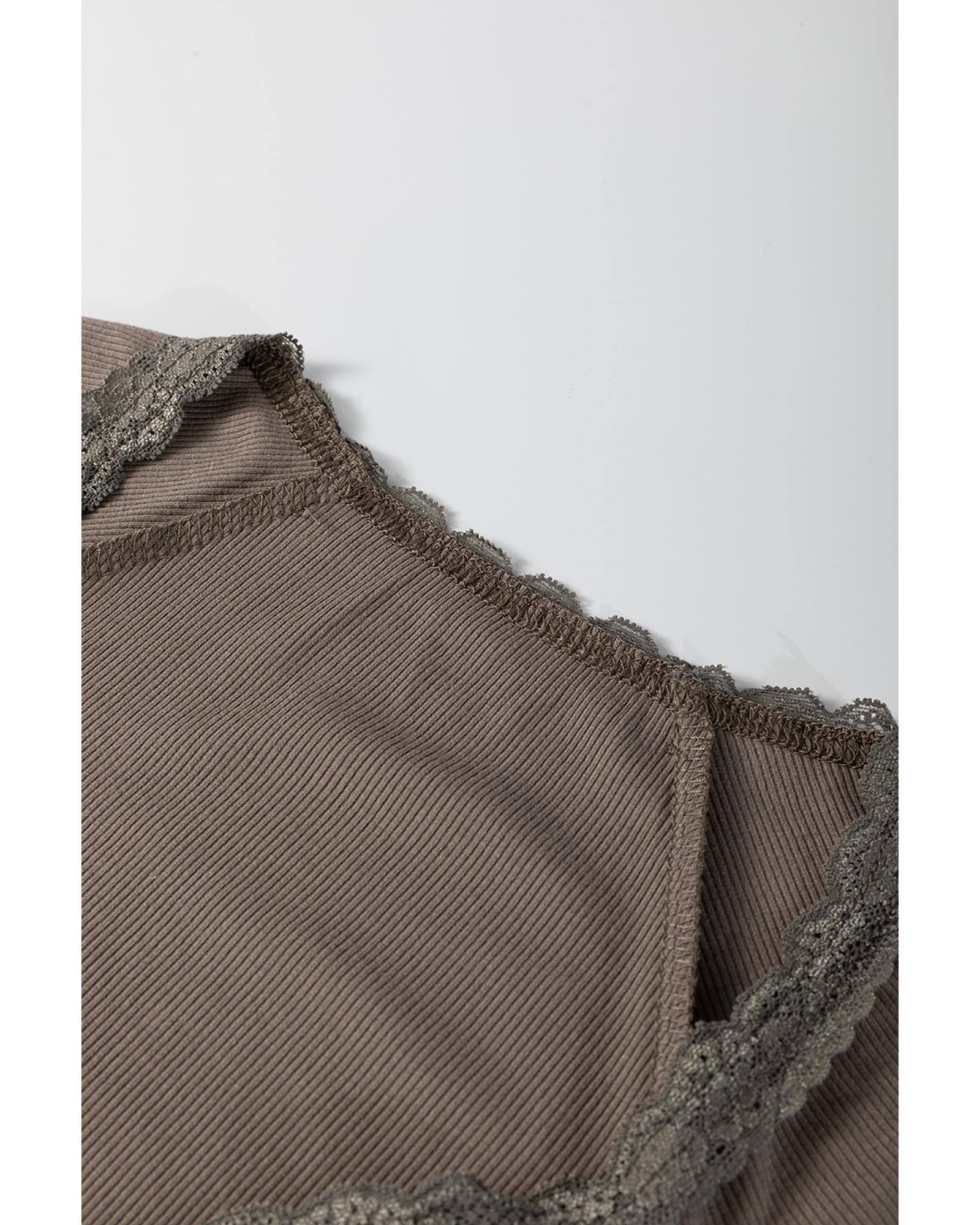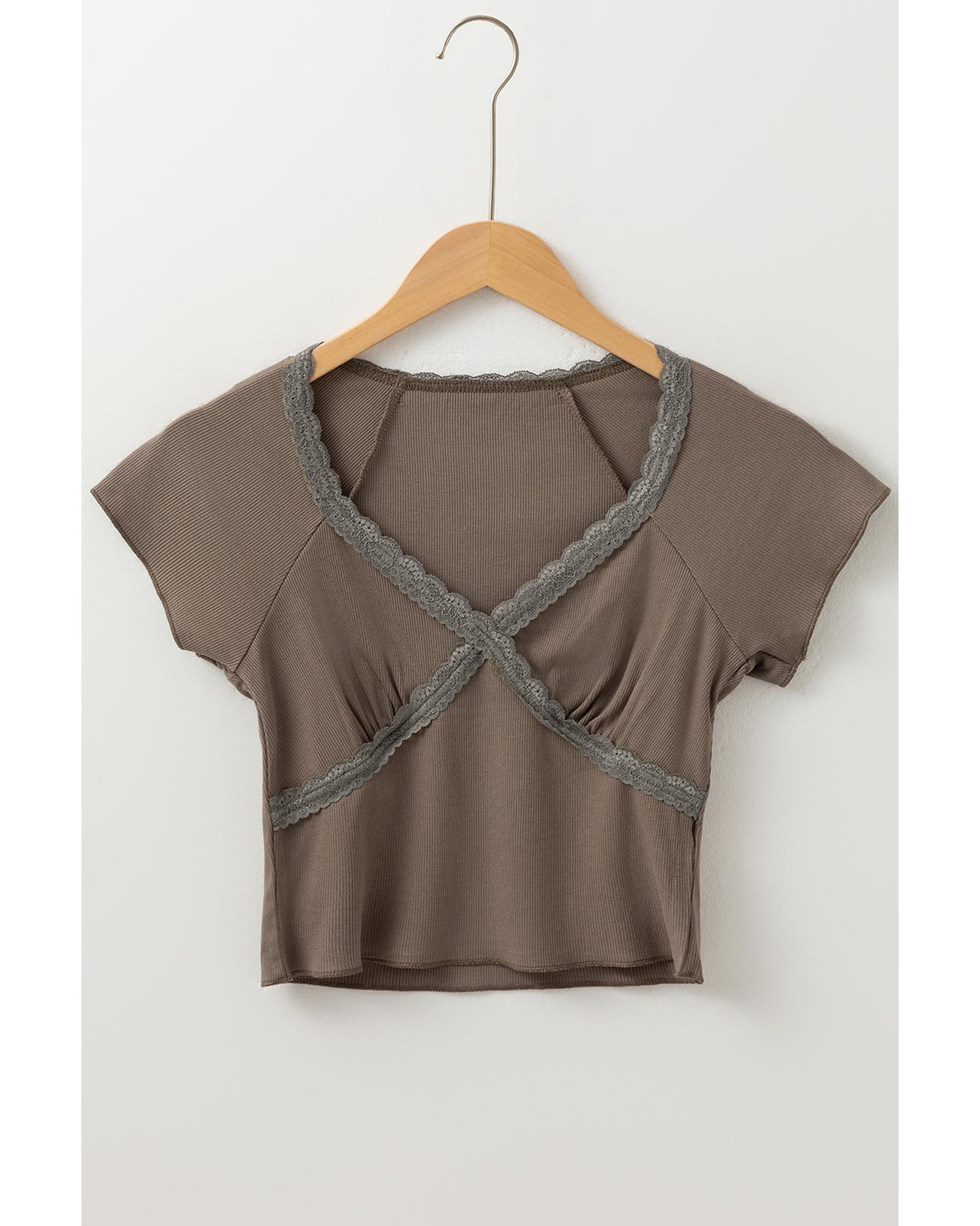 Dark Brown Lace Splicing Criss Cross Slim Fit V Neck T Shirt – XL
