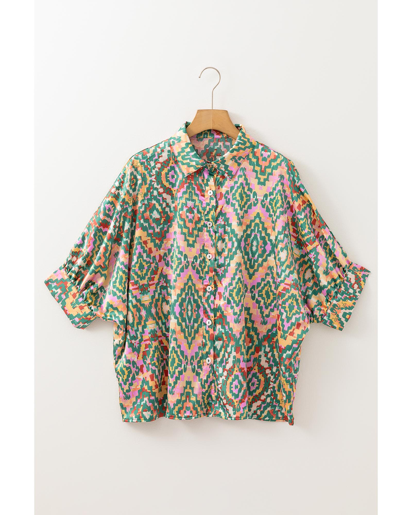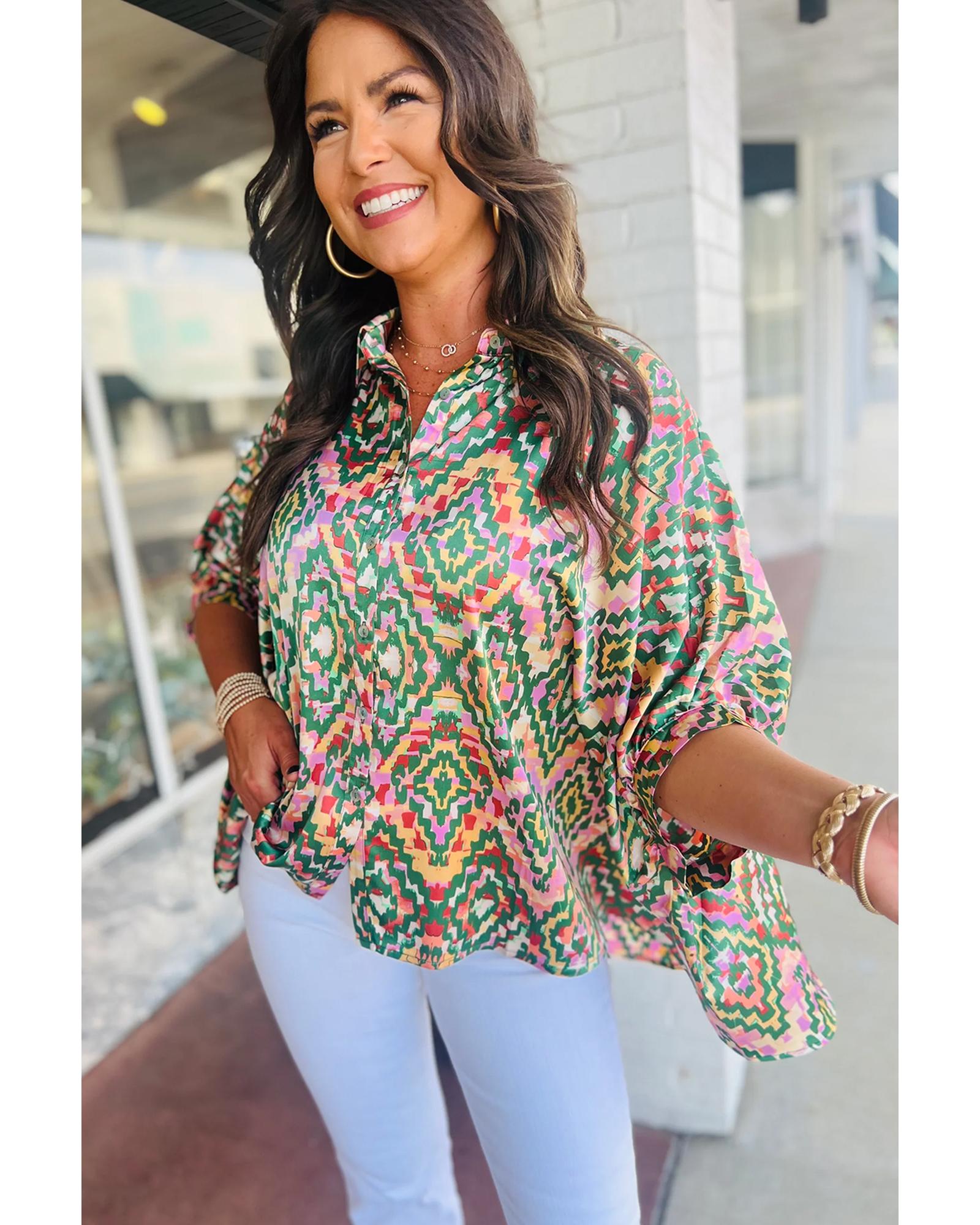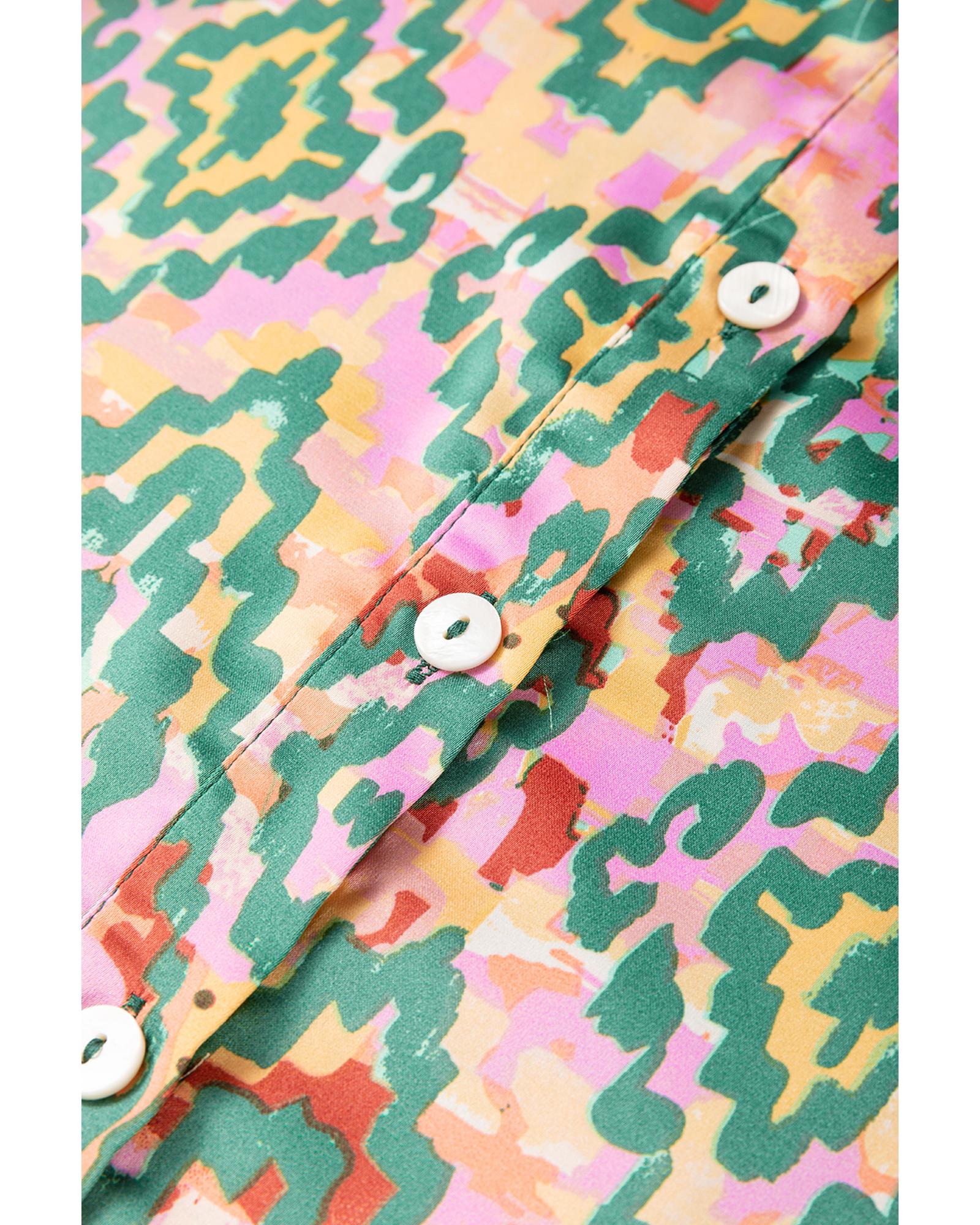 Dark Green Abstract Print Half Sleeve Button up Loose Shirt – S