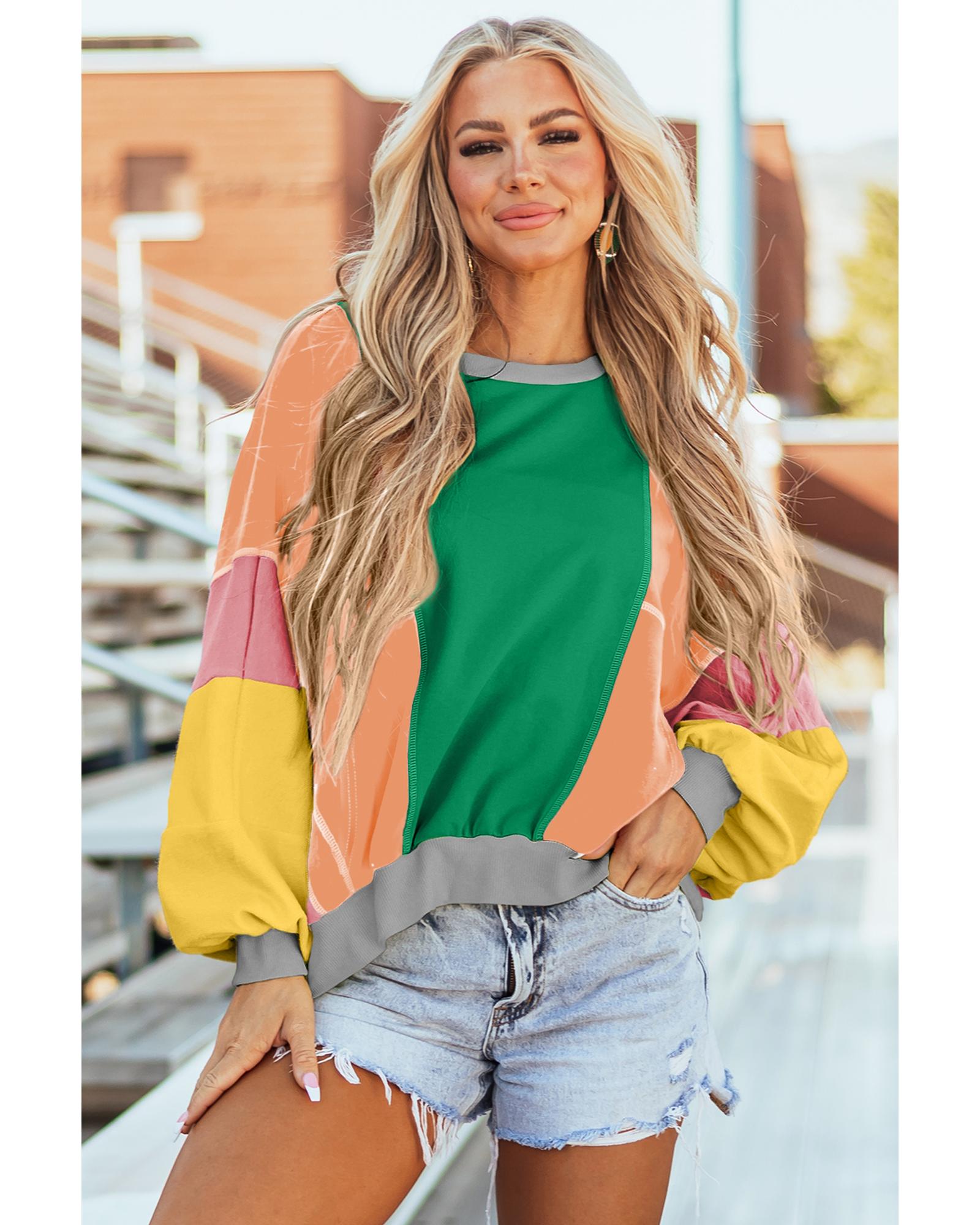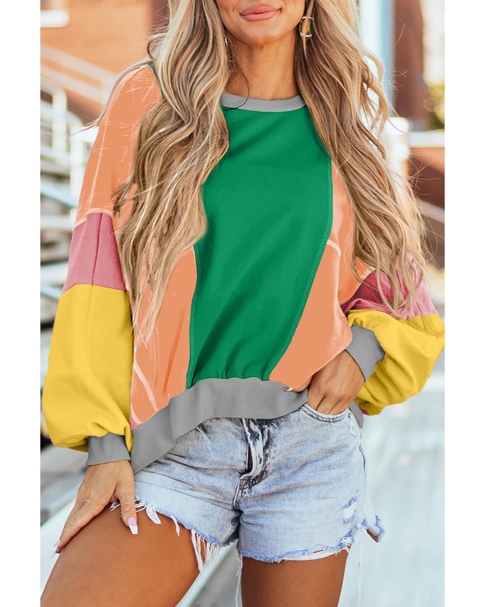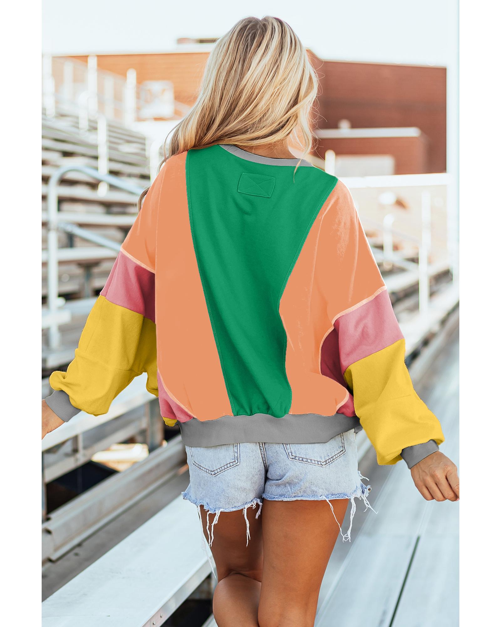 Dark Green Colorblock Patchwork Exposed Stitching Oversize Top – S