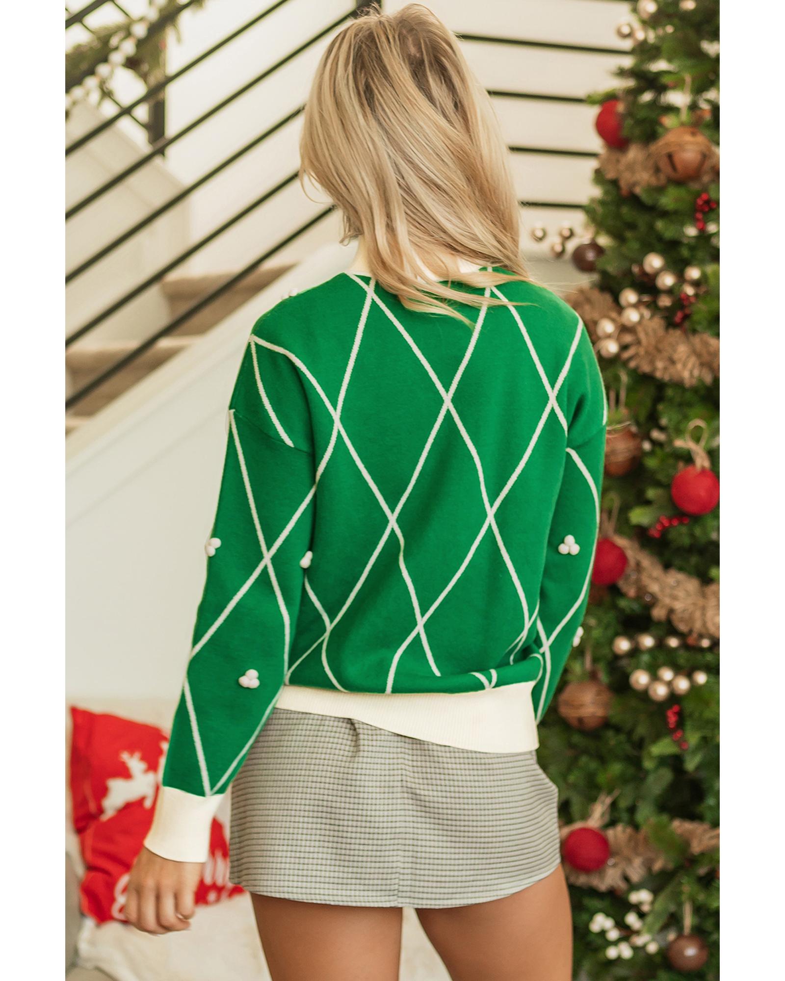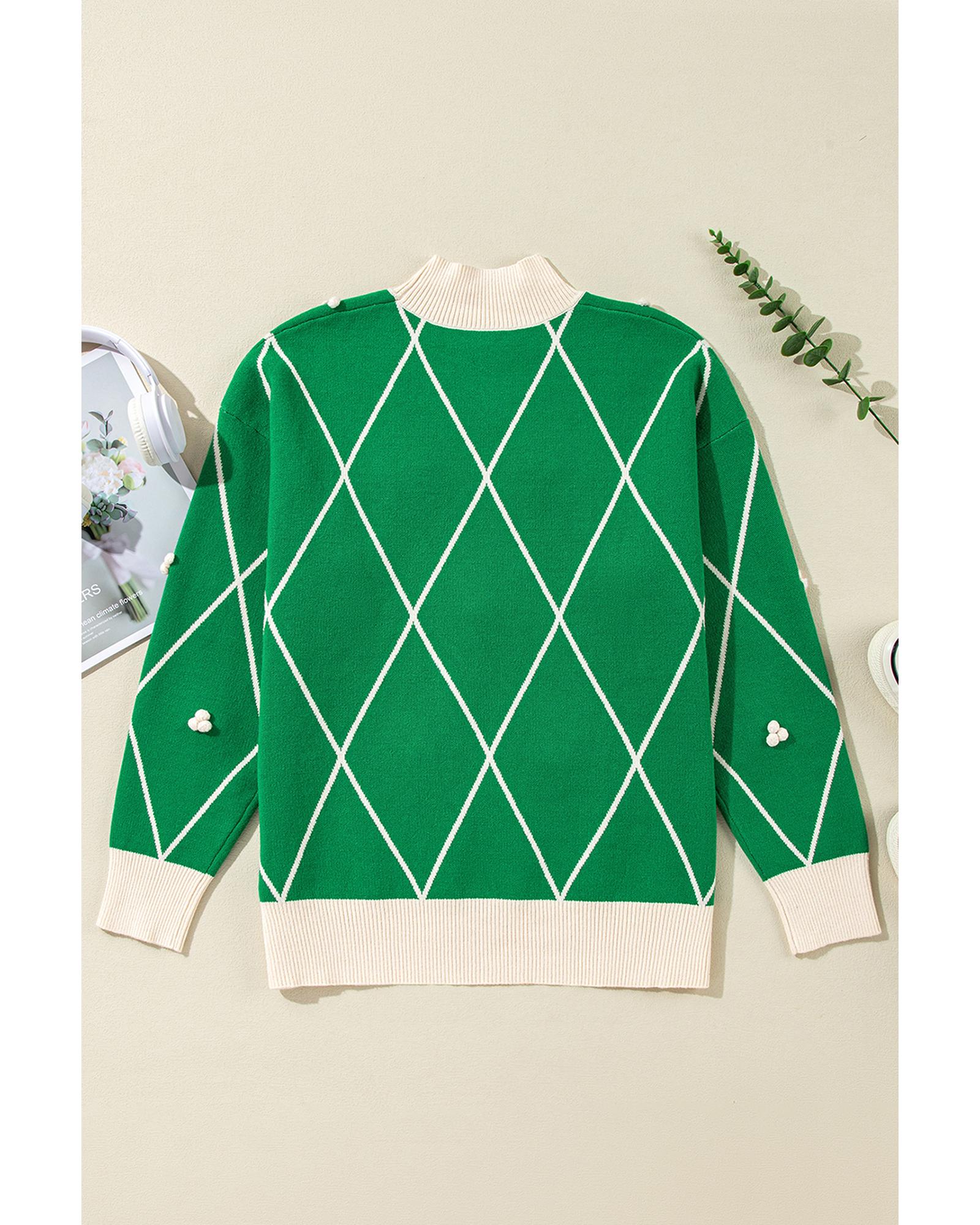 Dark Green Diamond Pattern Pom Accents Contrast Trim High Neck Sweater – L