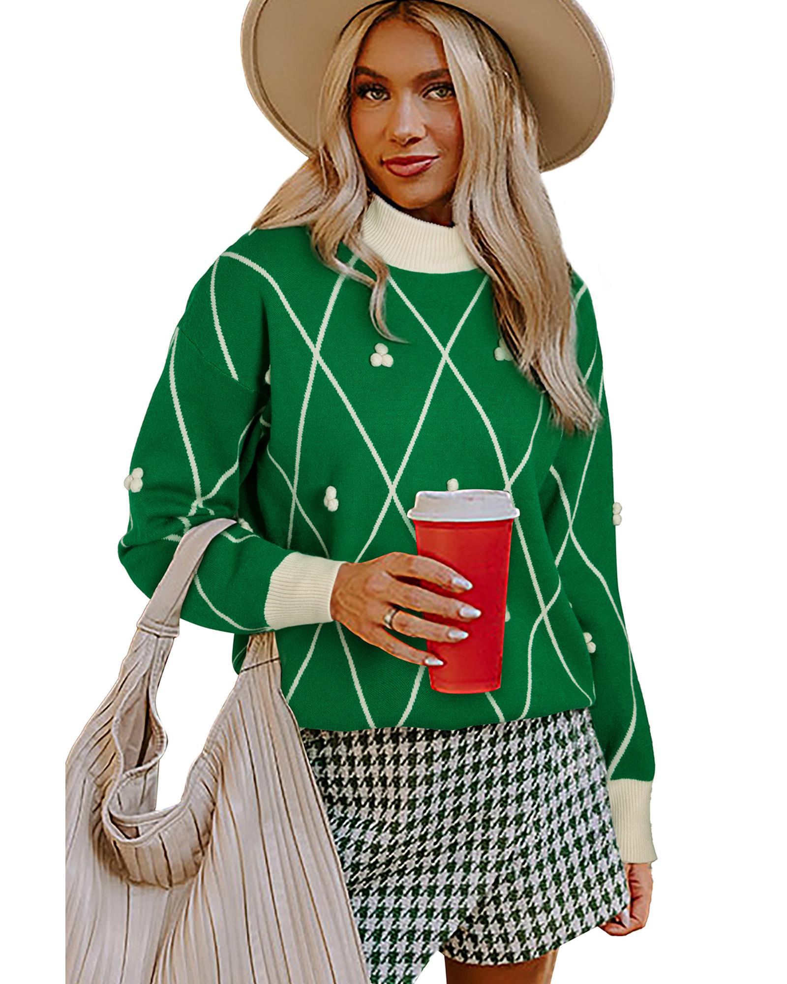Dark Green Diamond Pattern Pom Accents Contrast Trim High Neck Sweater – S