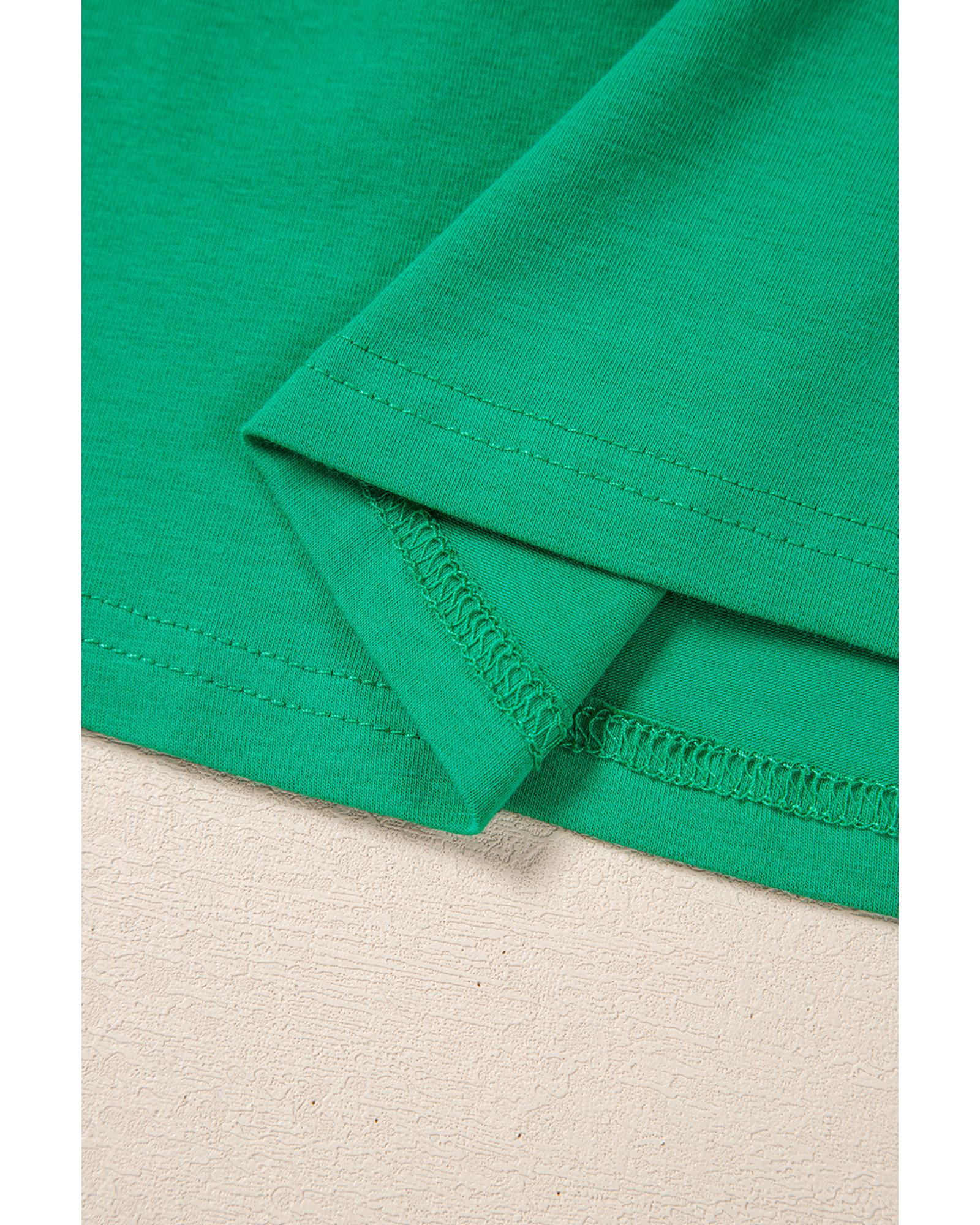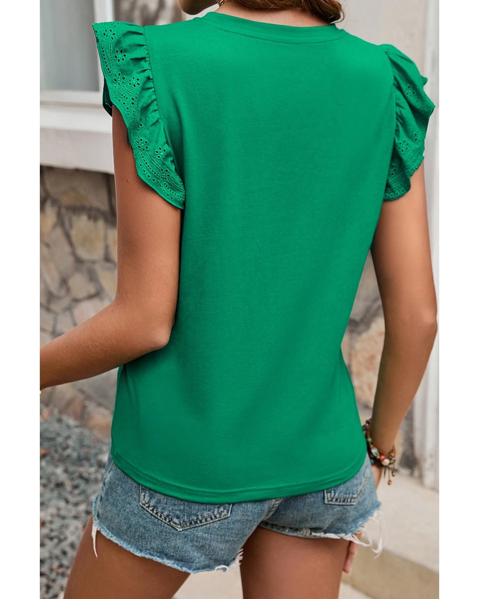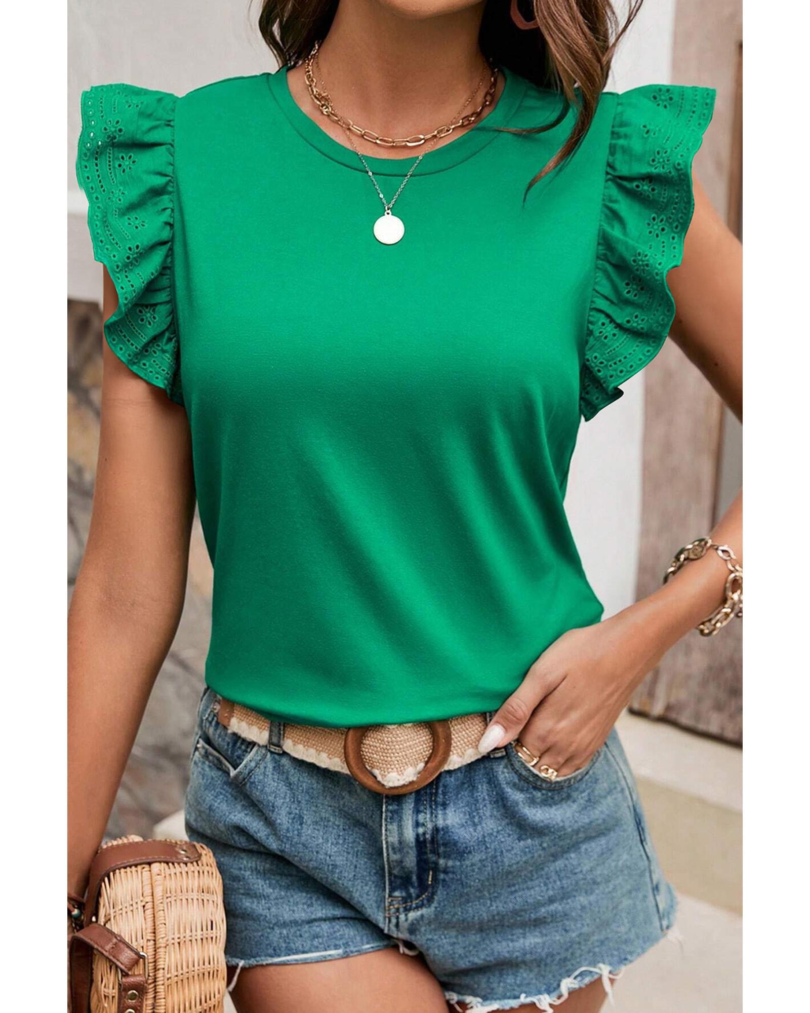 - Dark green embroidered ruffled sleeve slim fit crew neck top