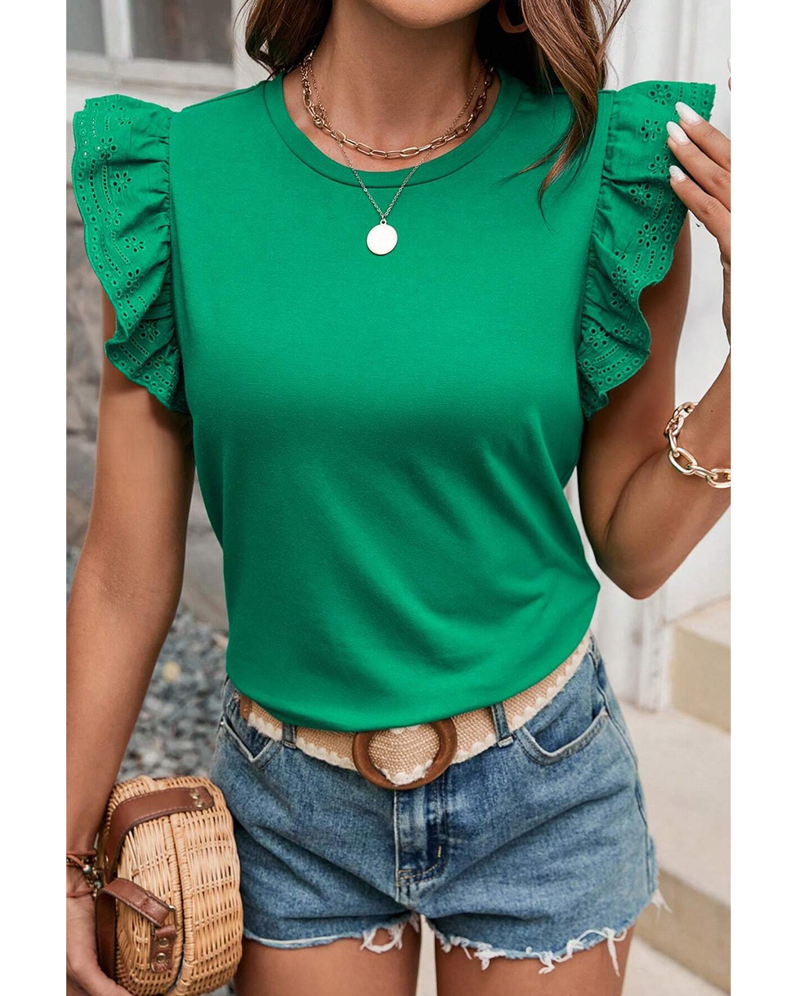 - Dark green embroidered ruffled sleeve slim fit crew neck top