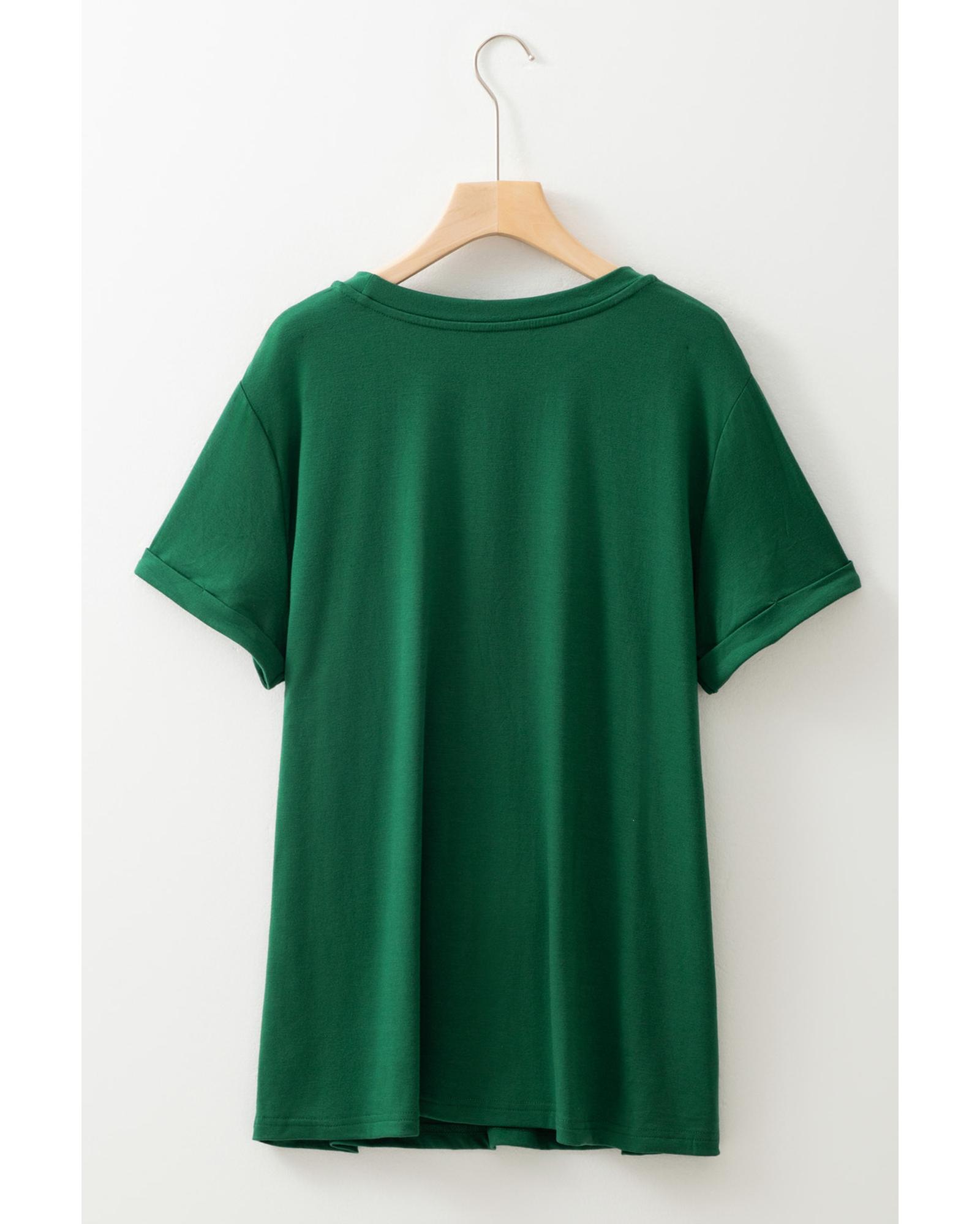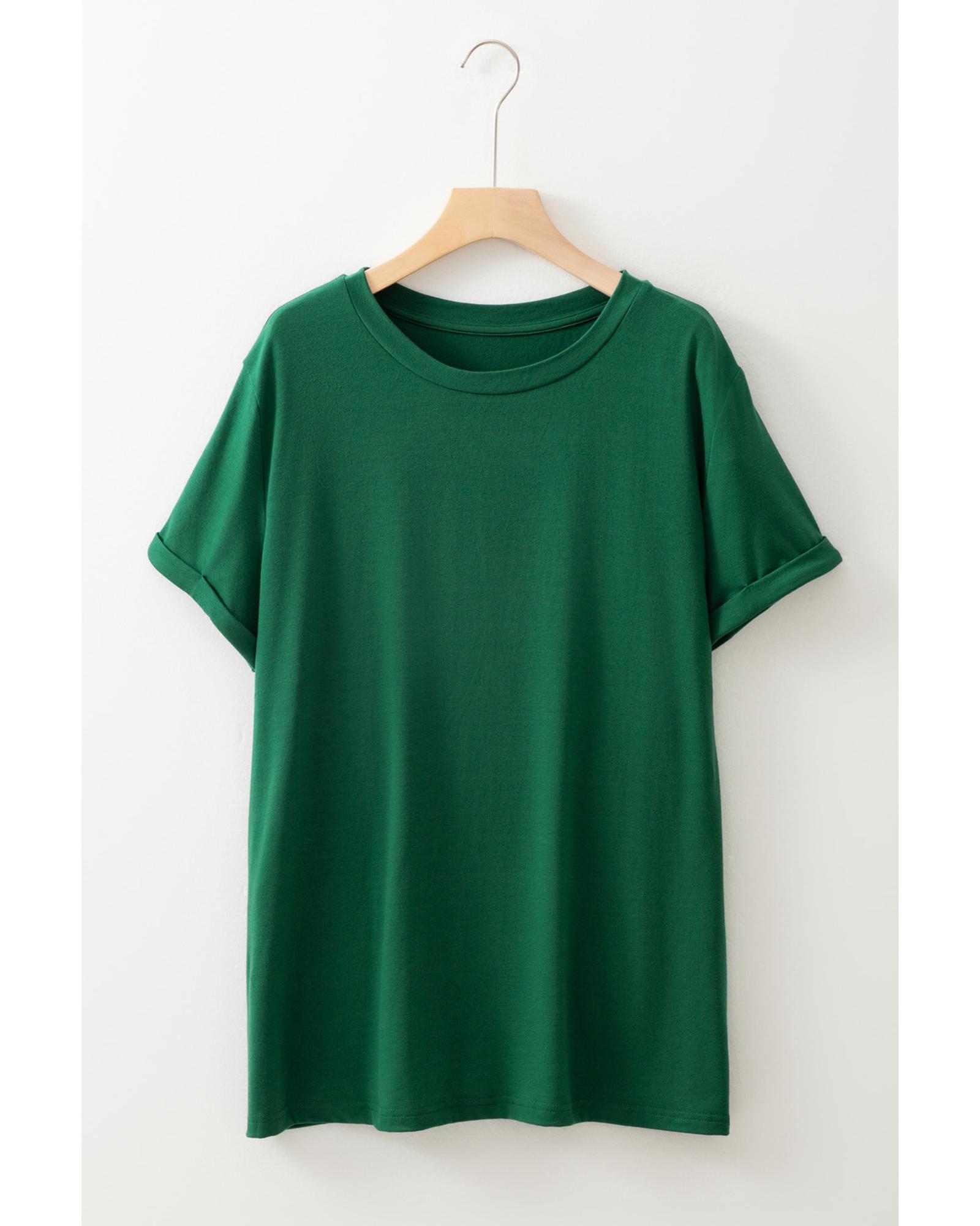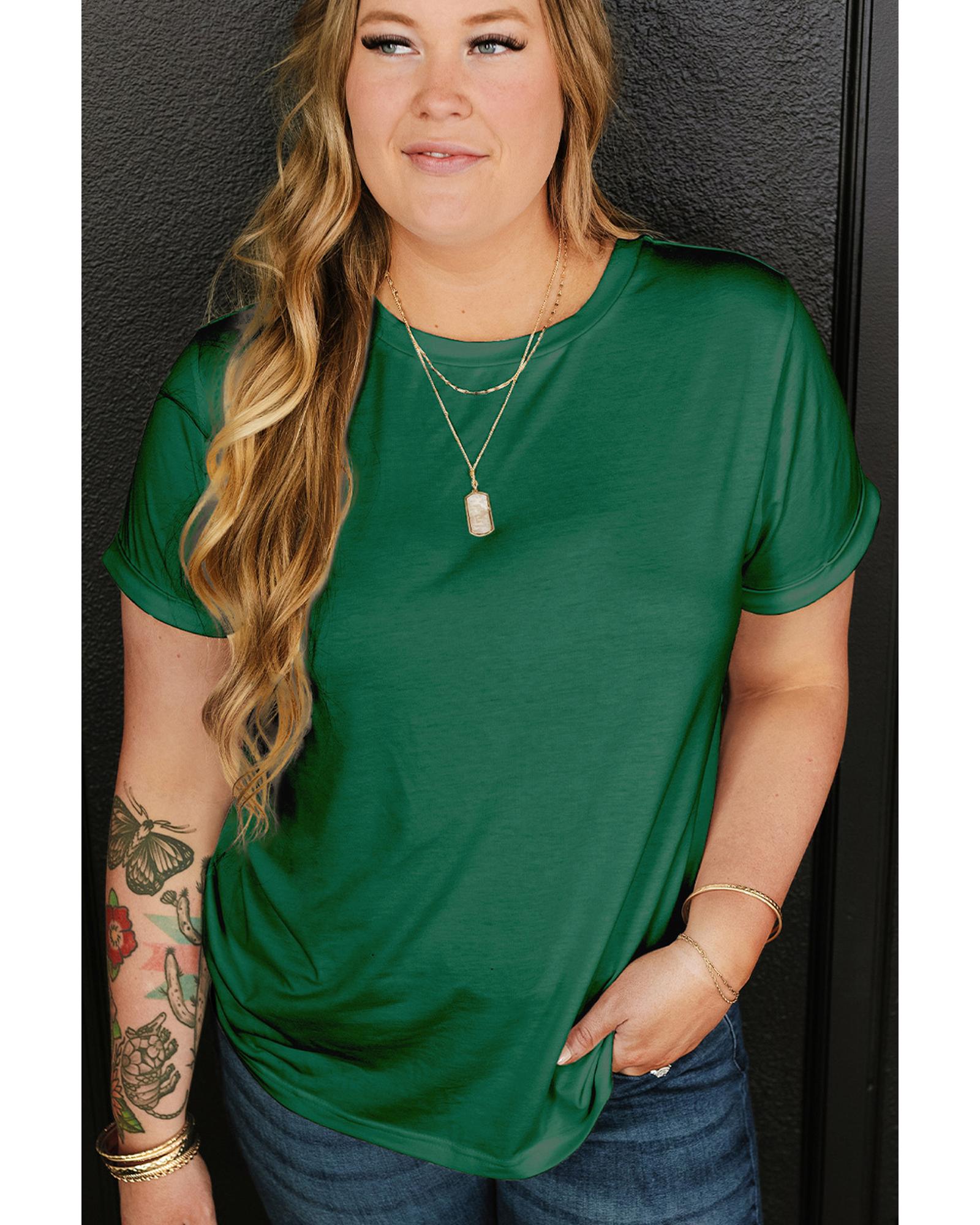 Dark Green Round Neck Rolled Sleeve Plus Size T-shirt – 2X