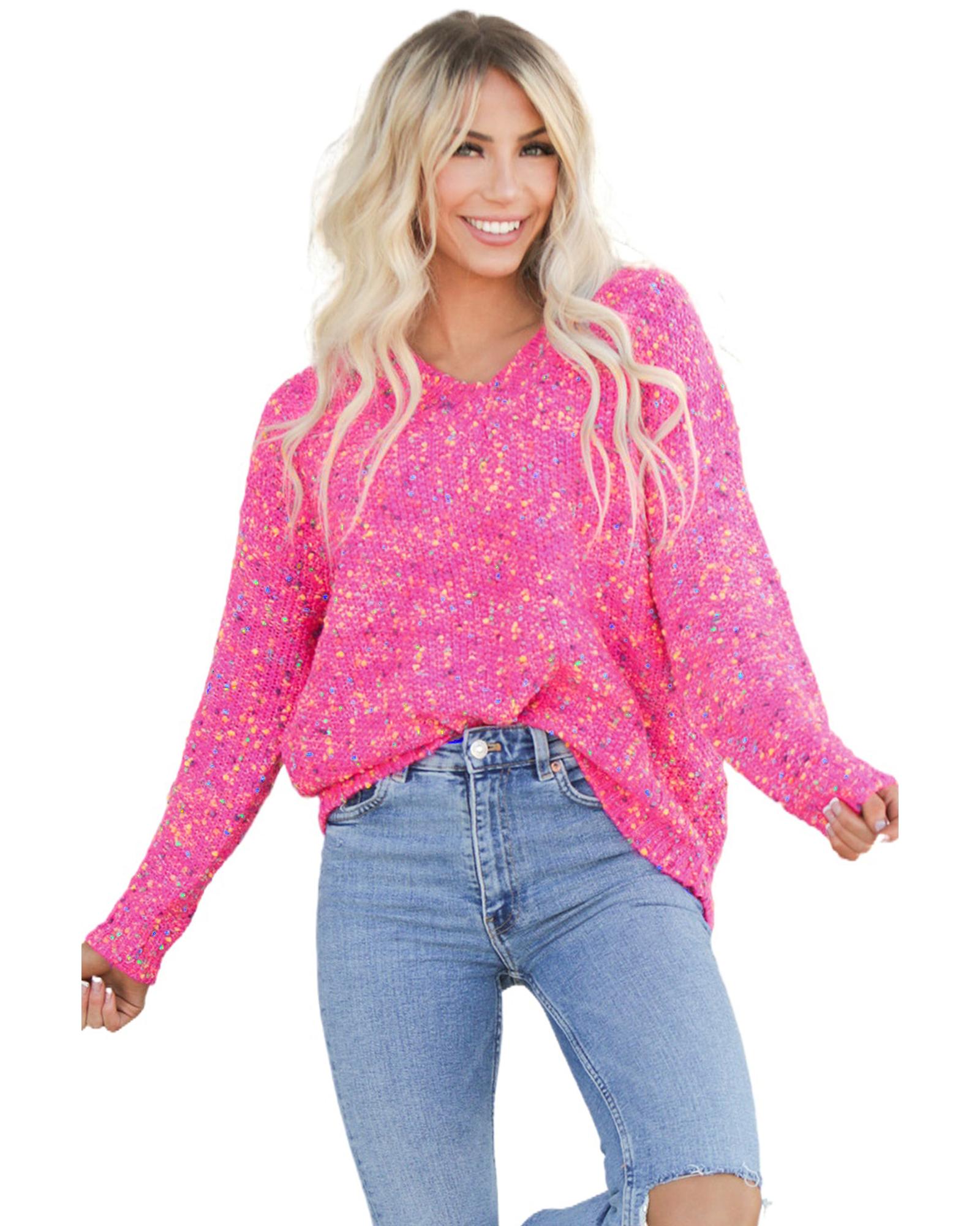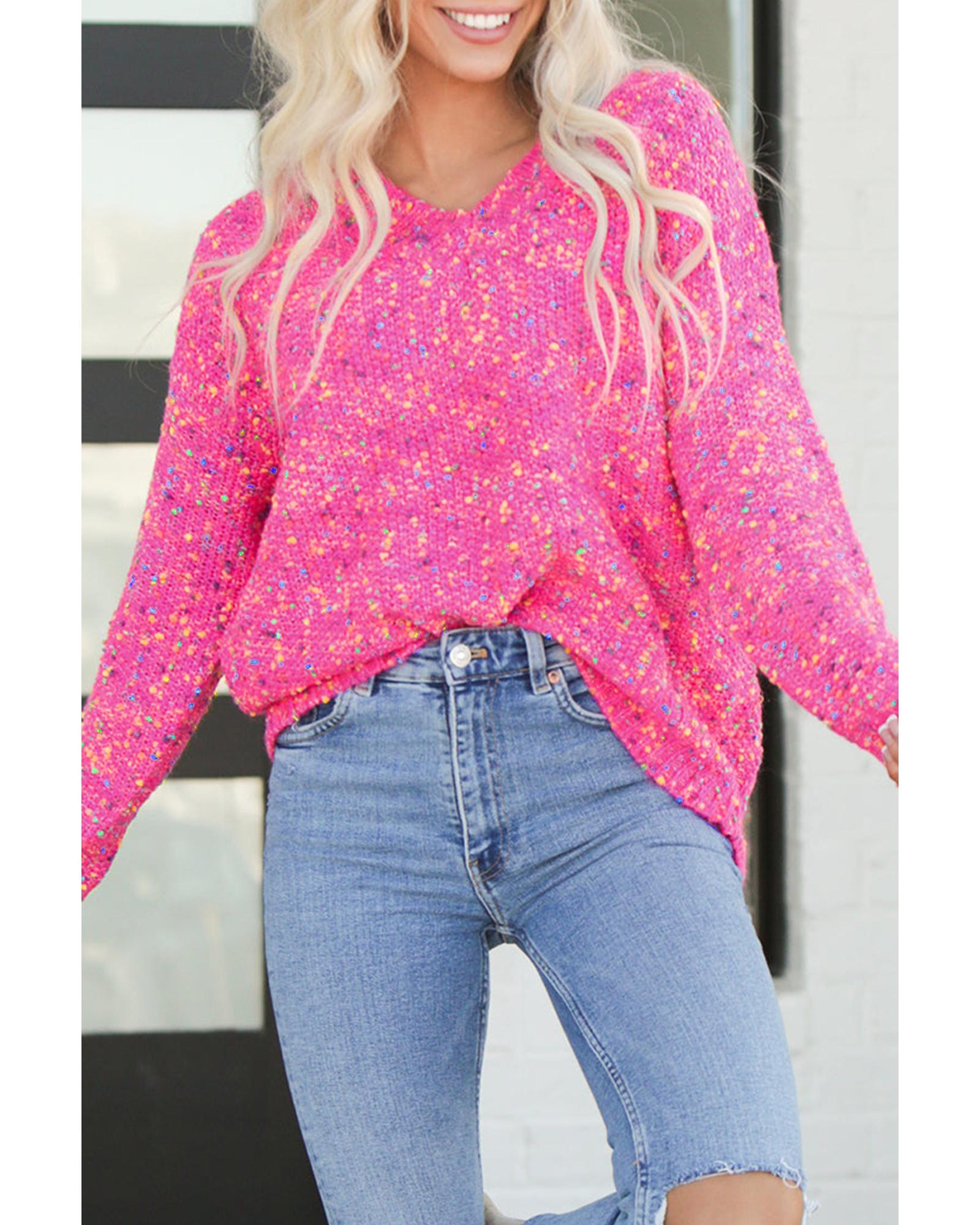 Dark Pink Colorful Spots Knitted V Neck Casual Sweater – M