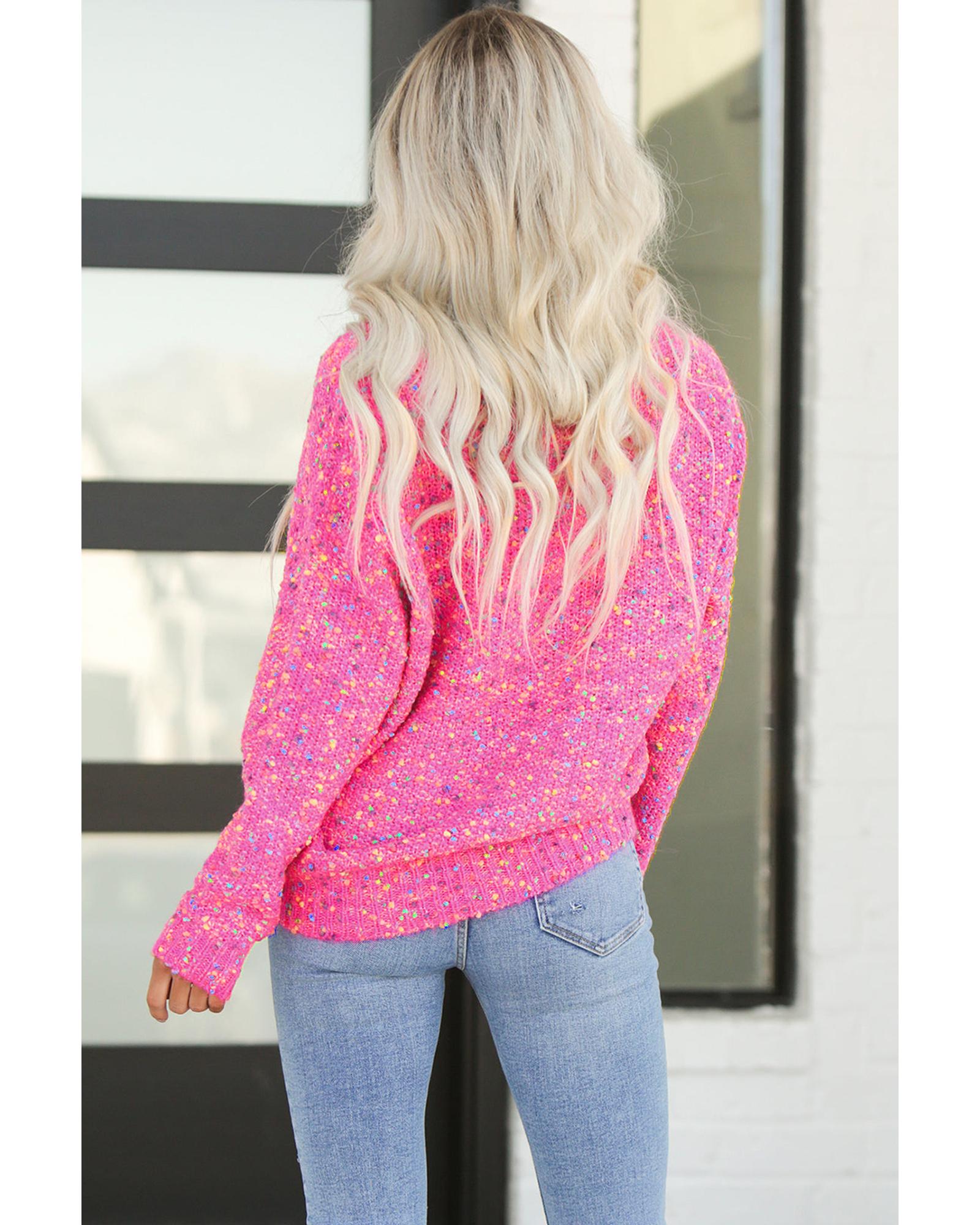 Dark Pink Colorful Spots Knitted V Neck Casual Sweater – S