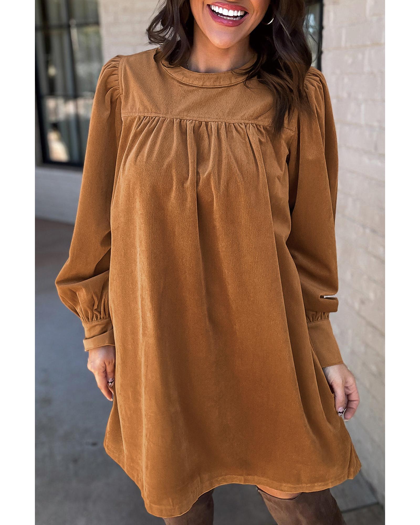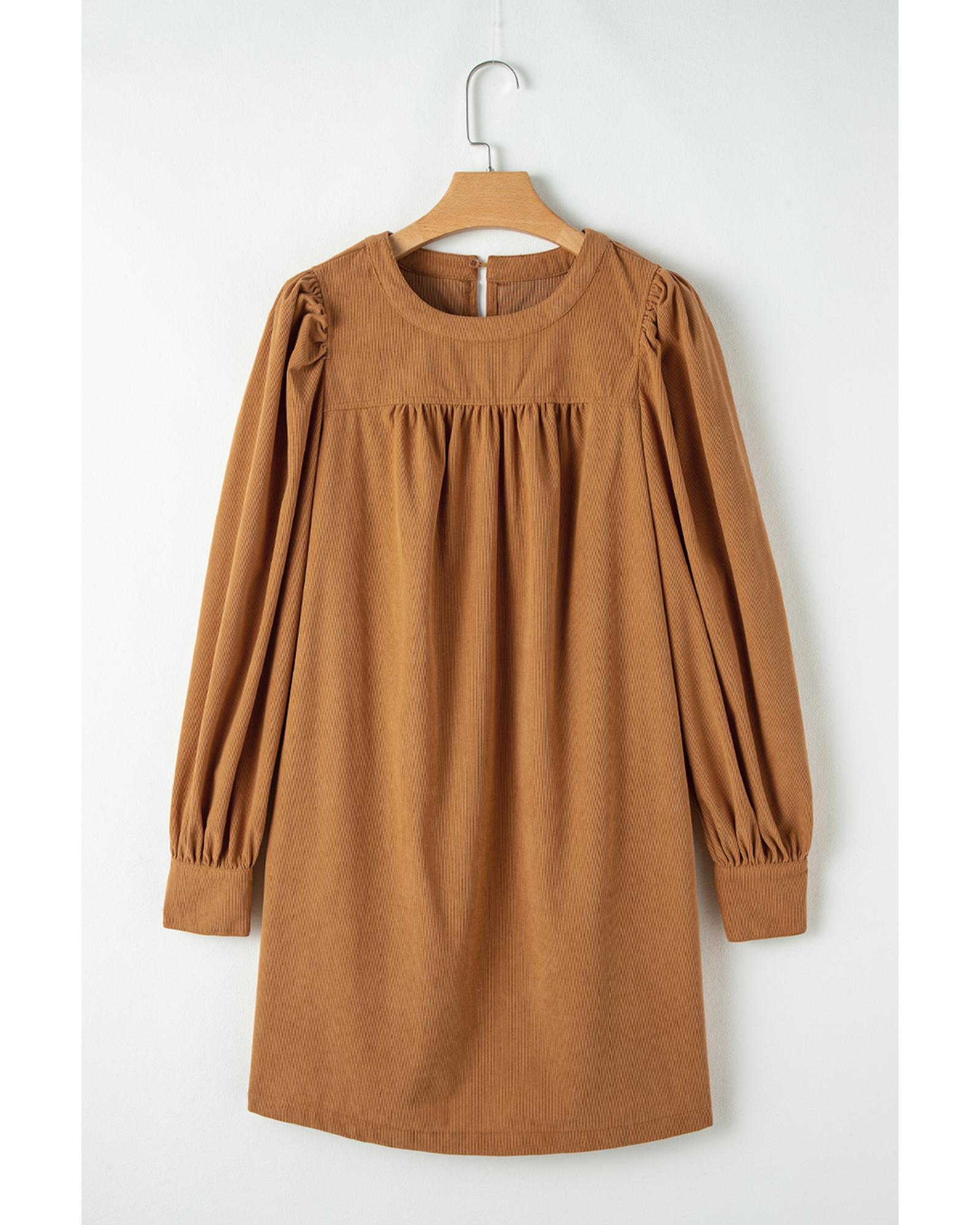 • Luxurious and elegant Desert Gold Corduroy Pleated Puff Sleeve Shift Short Dress