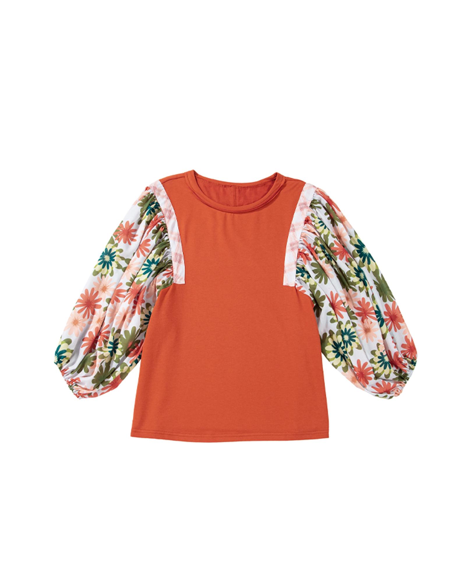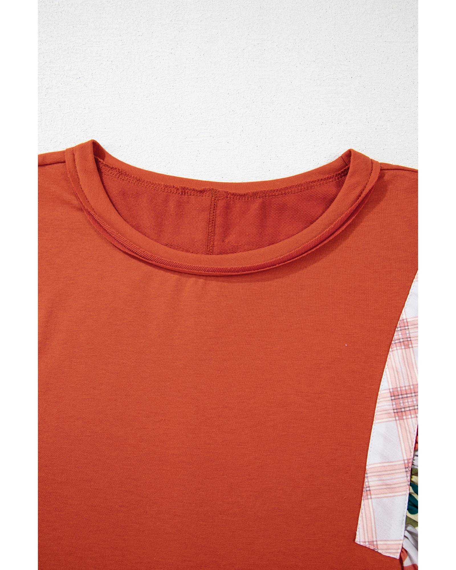 Orange Floral Color Block Patchwork Ruffled Hem Round Neck Blouse - L