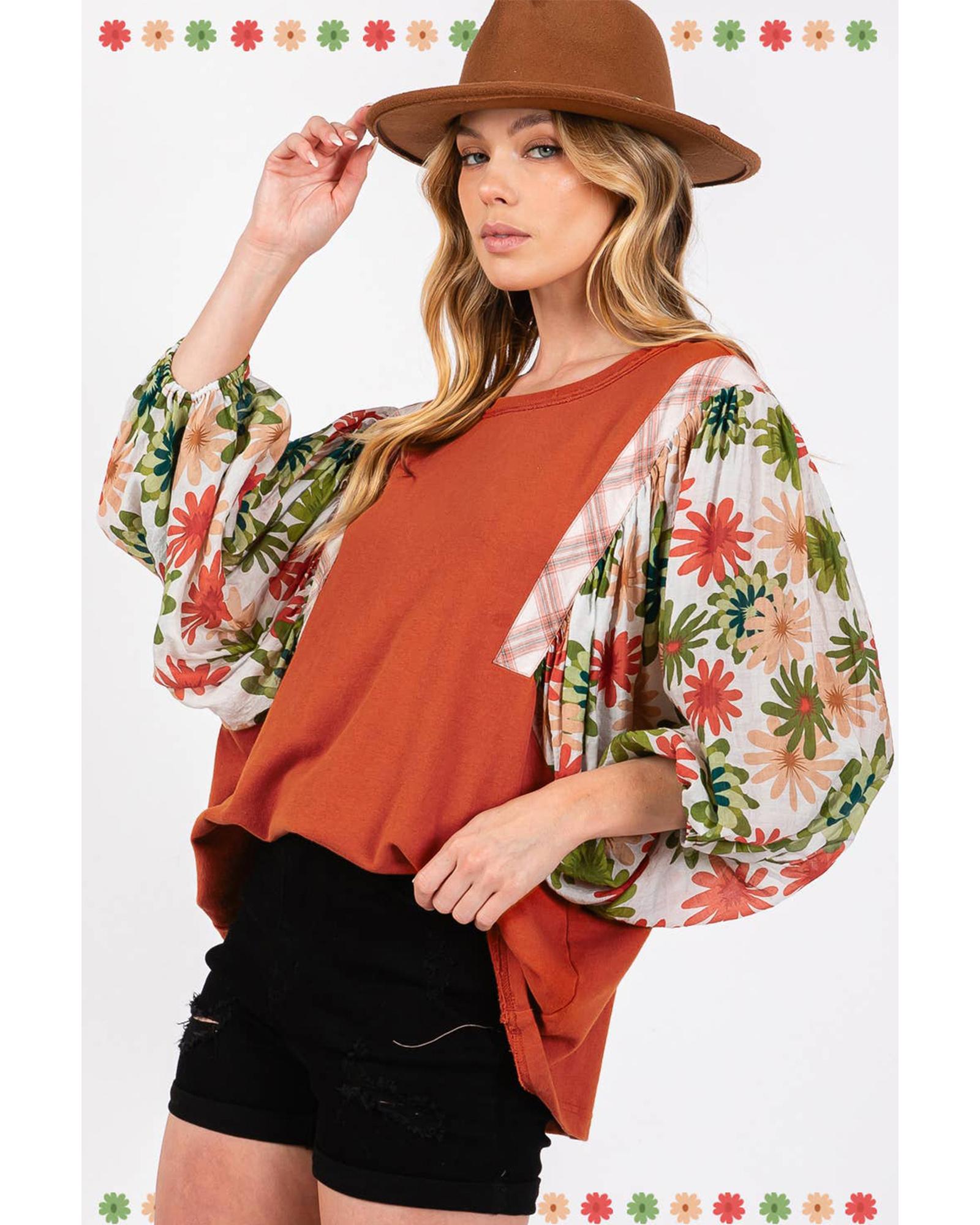 Desert Gold Floral Puff Sleeve Patchwork Round Neck Blouse – L