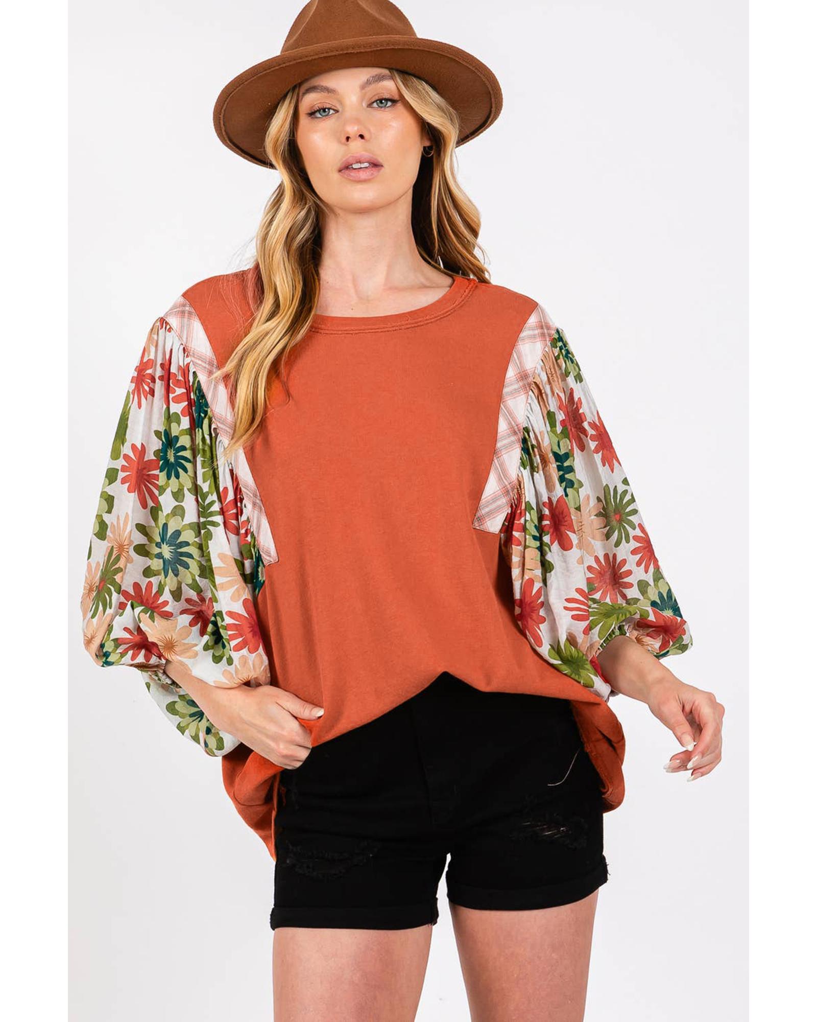 Desert Gold Floral Puff Sleeve Patchwork Round Neck Blouse – M