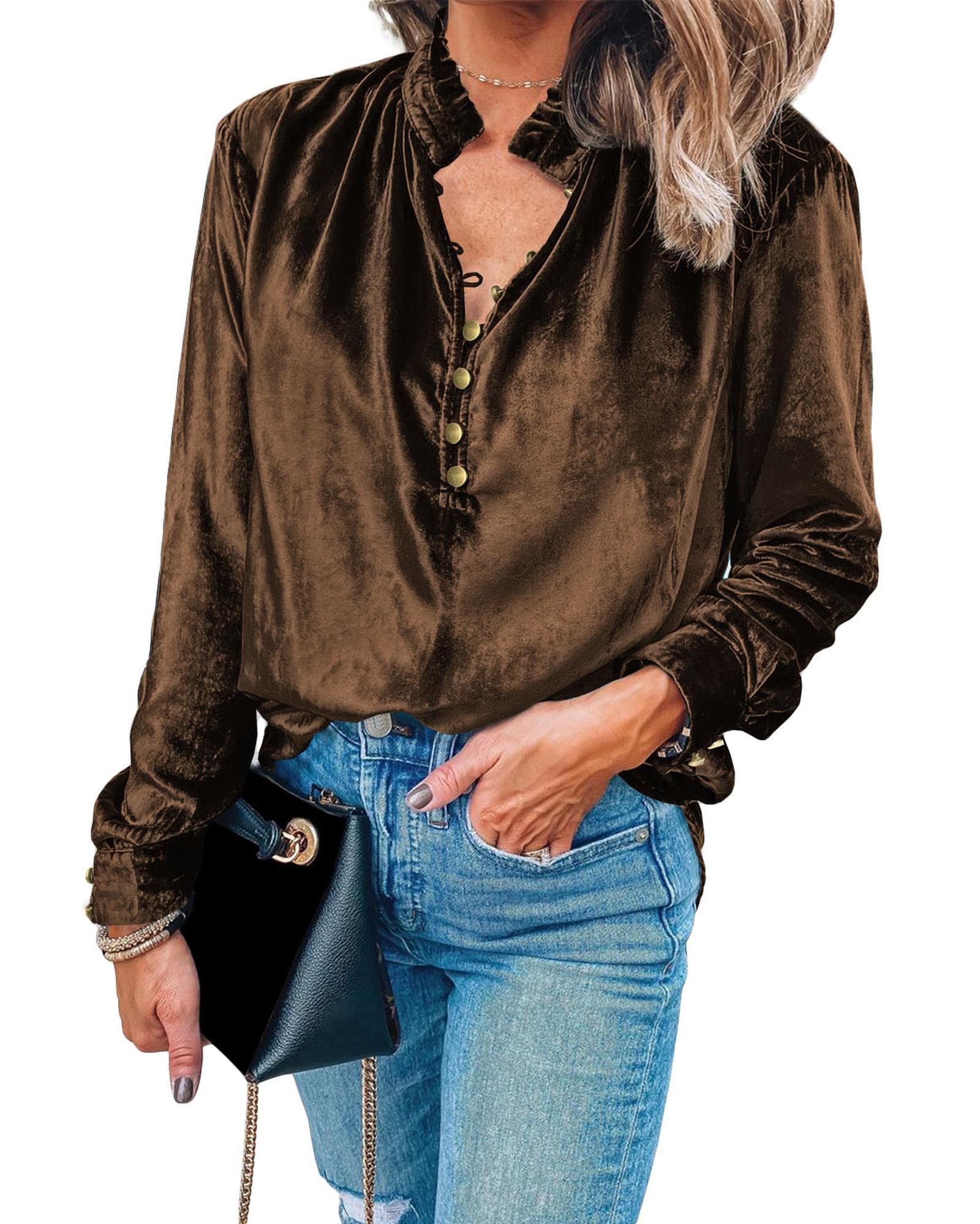 Desert Palm Frilled Neck Buttoned Front Velvet Top – XL