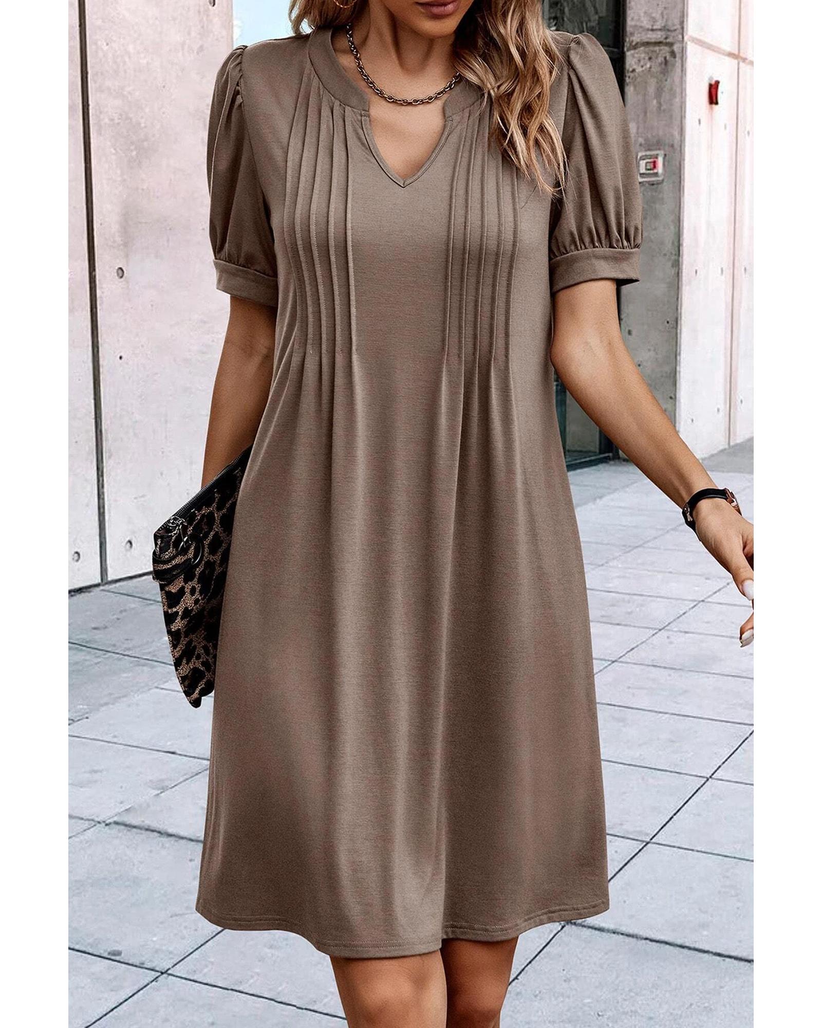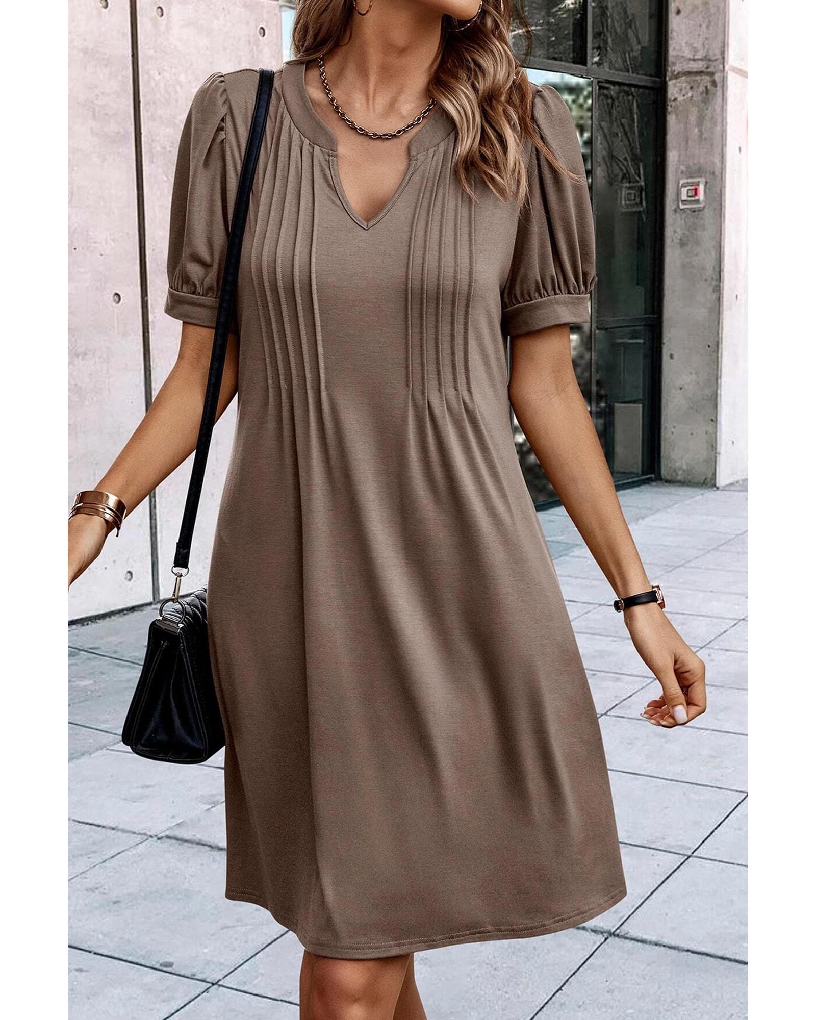 Desert Palm Notched Neck Pleated Puff Sleeve Shift T-shirt Dress – S