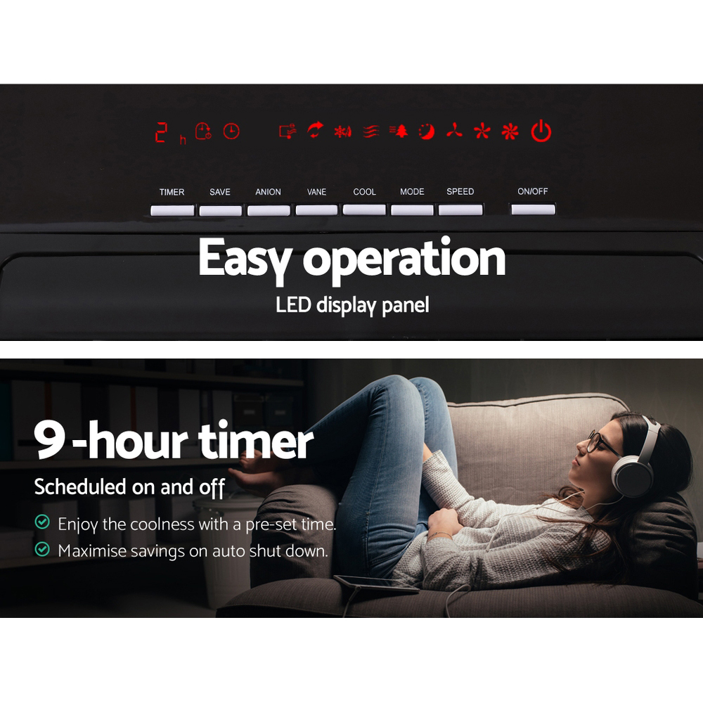 Our Devanti Evaporative Air Cooler is an air cooler and humidifier rolled into one compact and stylish machine. To use it as an air cooler, simply prepare the included ice crystals according to instructions, leave it in the 8L water tank and turn on the evaporative cooler to get super cool breezes throughout the room with its adjustable louvres and 60~ oscillation. The removable filters and the built-in ioniser together effectively eliminate all pollutants such as dust, pollen, cigarette smoke, bacteria and odours, to deliver purified air. The evaporative air cooler utilises an energy-efficient 3-speed cyclone fan with three working modes (normal, natural and sleep), and is fitted with handles and four castor wheels for easy mobility. Not least, the LED digital control panel enables easy operation, with a remote control included for extra convenience.