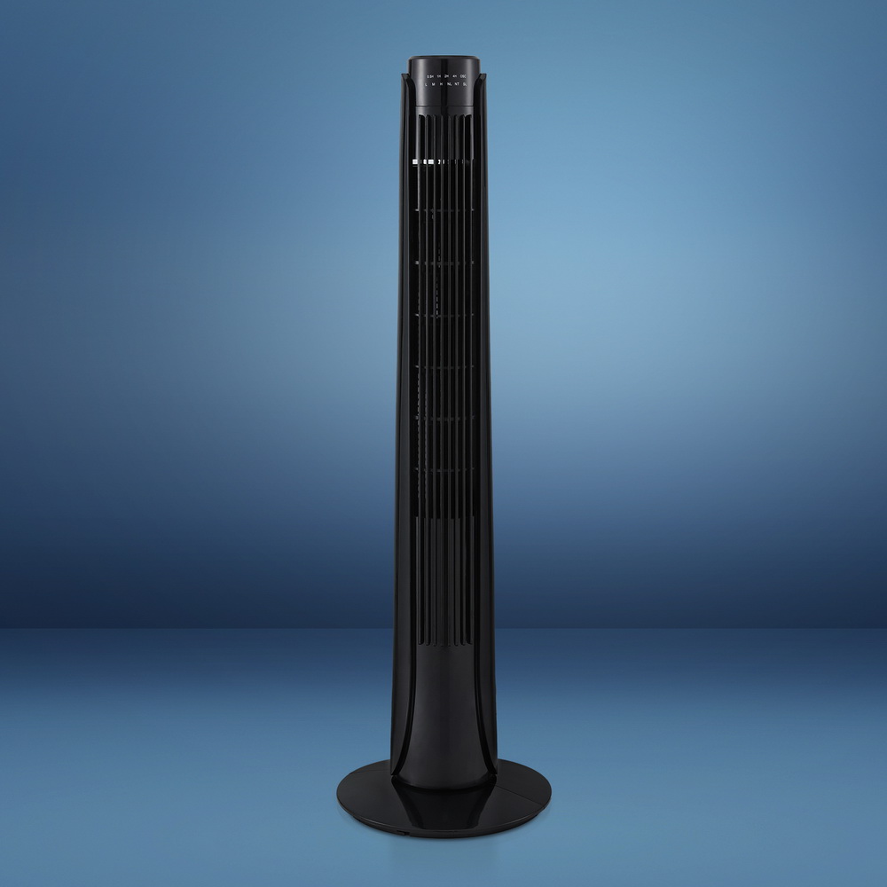 Our Devanti tower fan boasts a touch panel or remote control, wide air coverage, and a slim design. It includes overheat protection for safety and practicality.