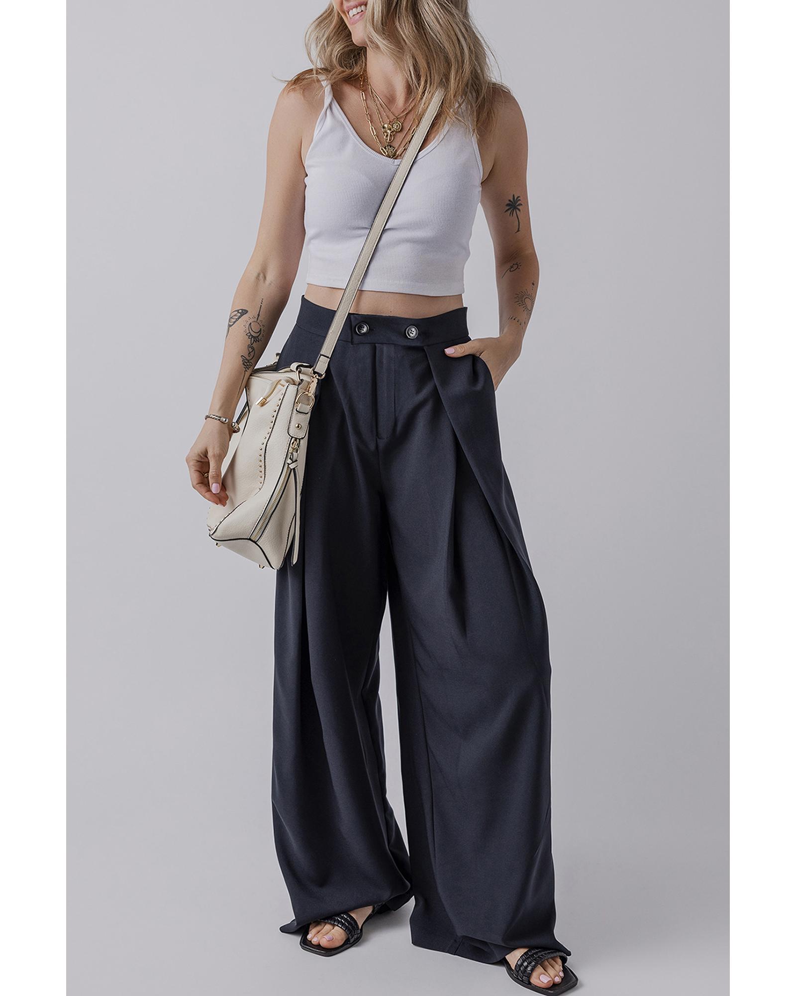 Dirty blue Dual Buttoned High Waist Pleated Wide Leg Pants – L