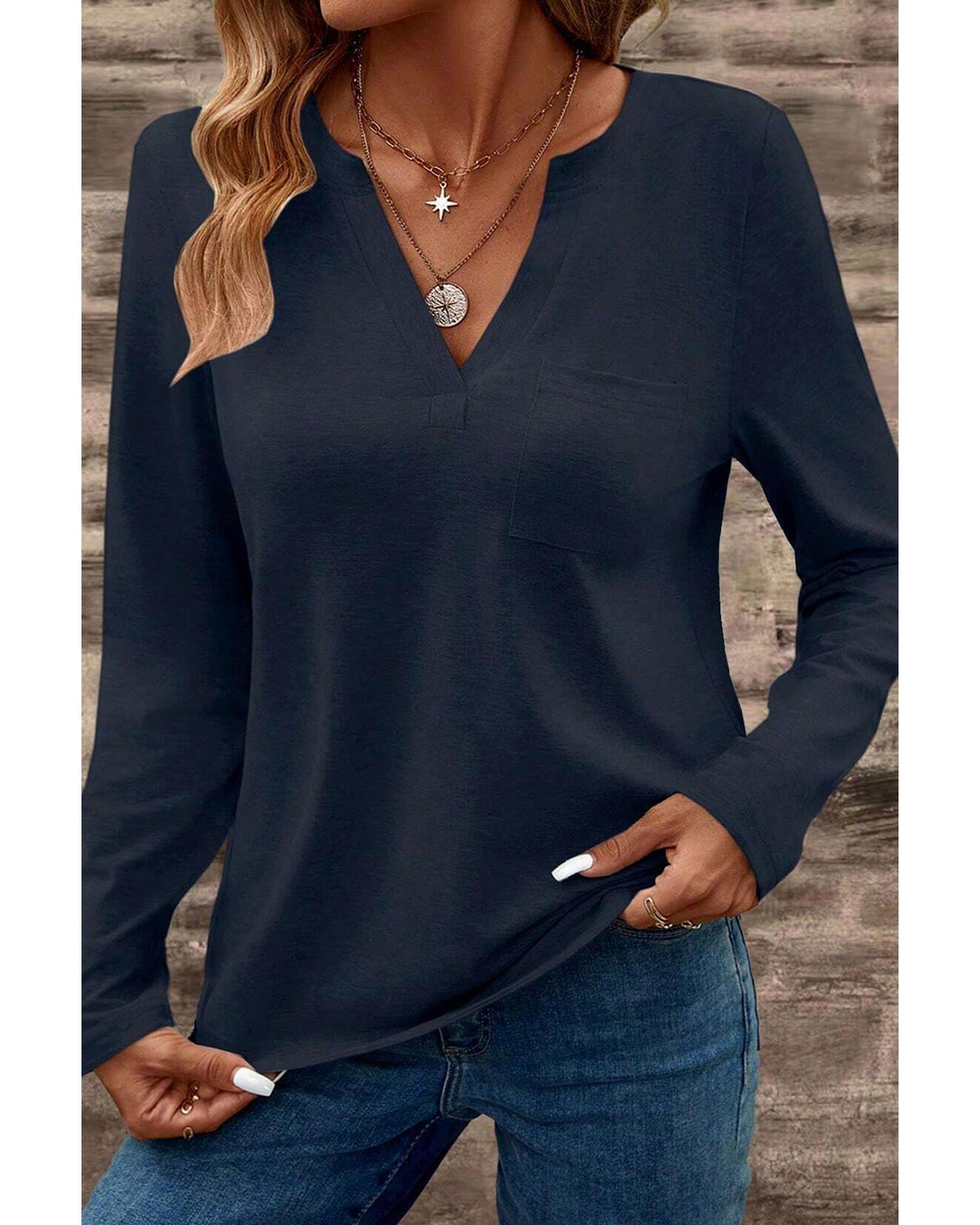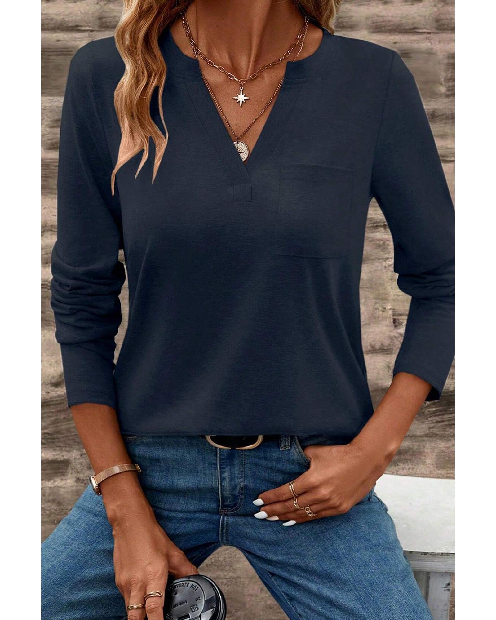 Dirty blue Notch V Neck Pocket Patched Long Sleeve T Shirt – L