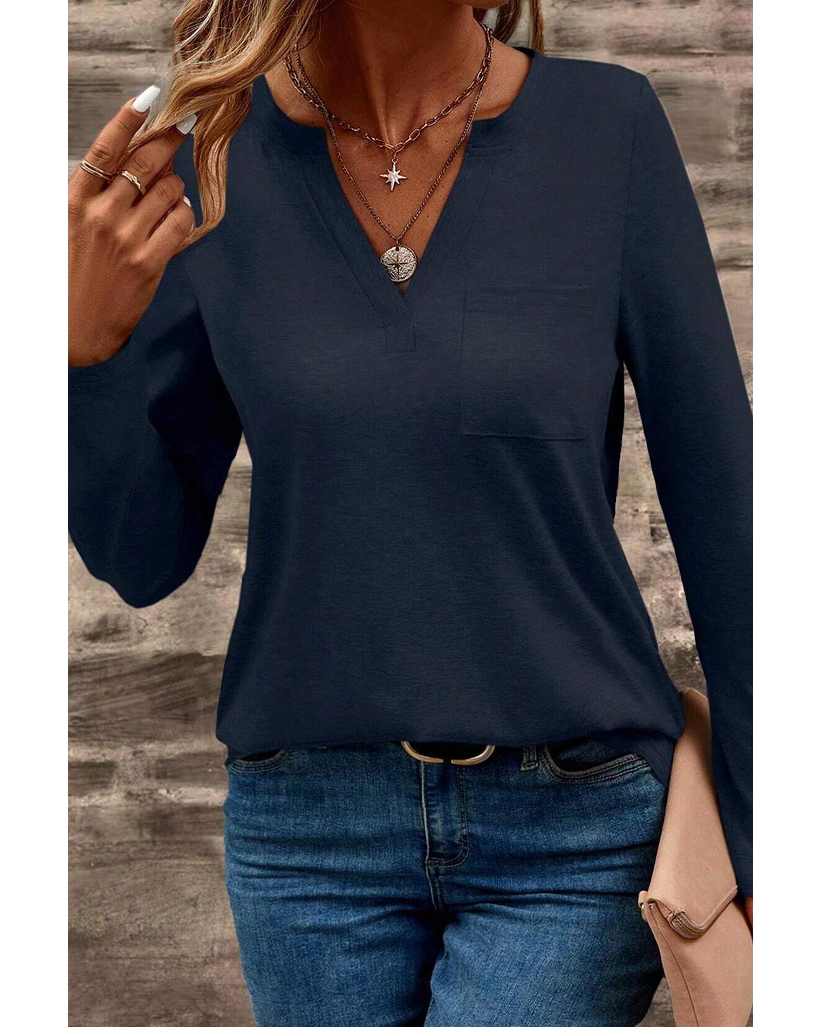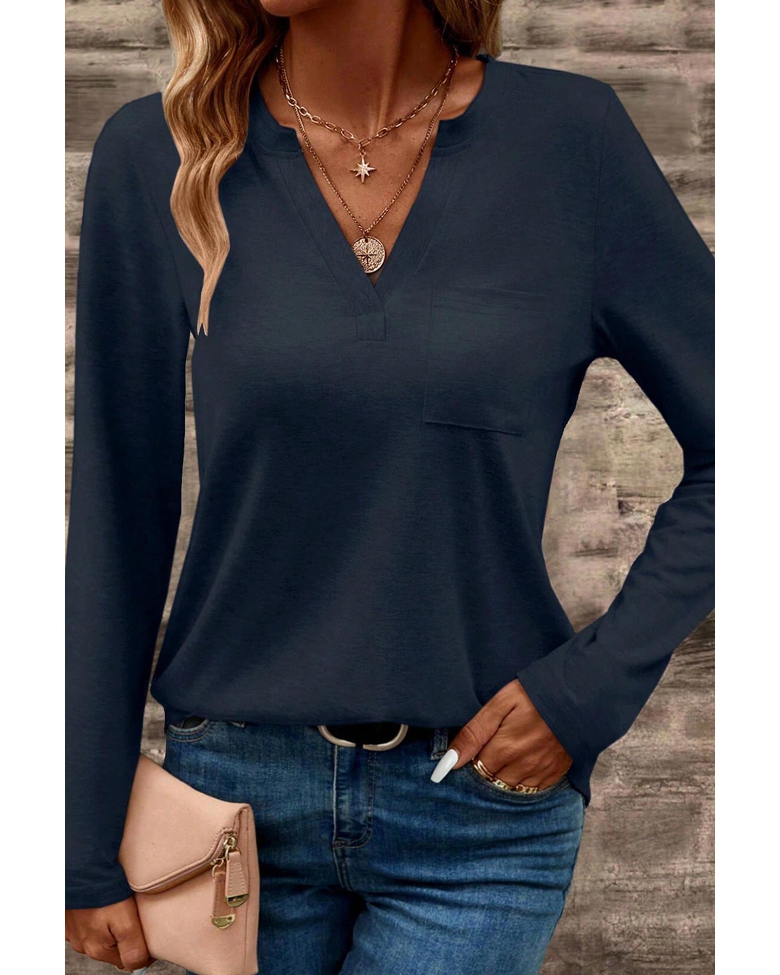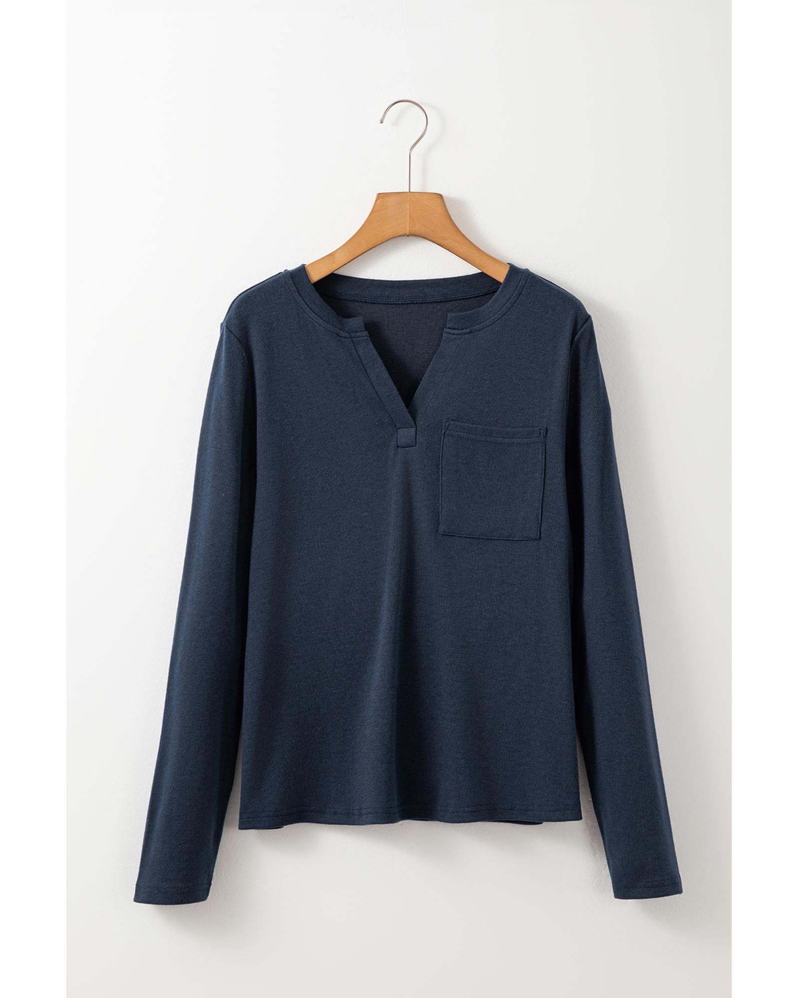Dirty blue Notch V Neck Pocket Patched Long Sleeve T Shirt – M