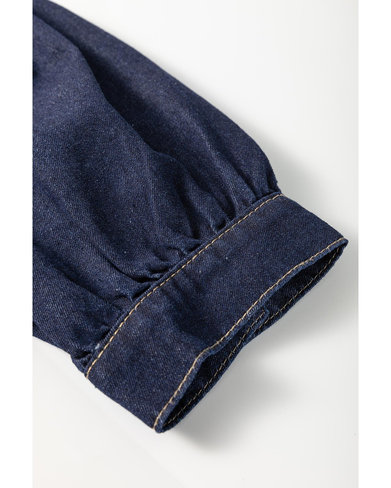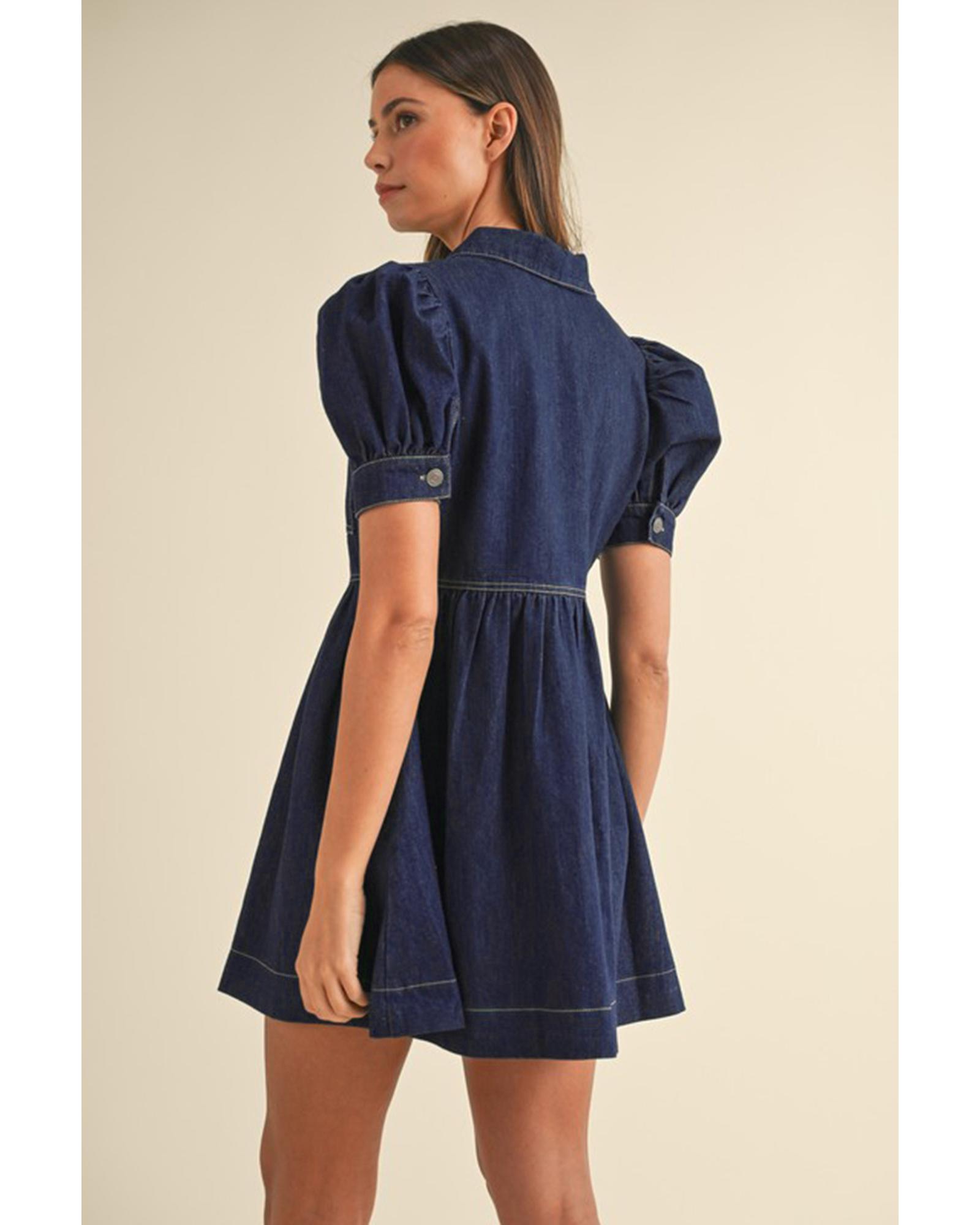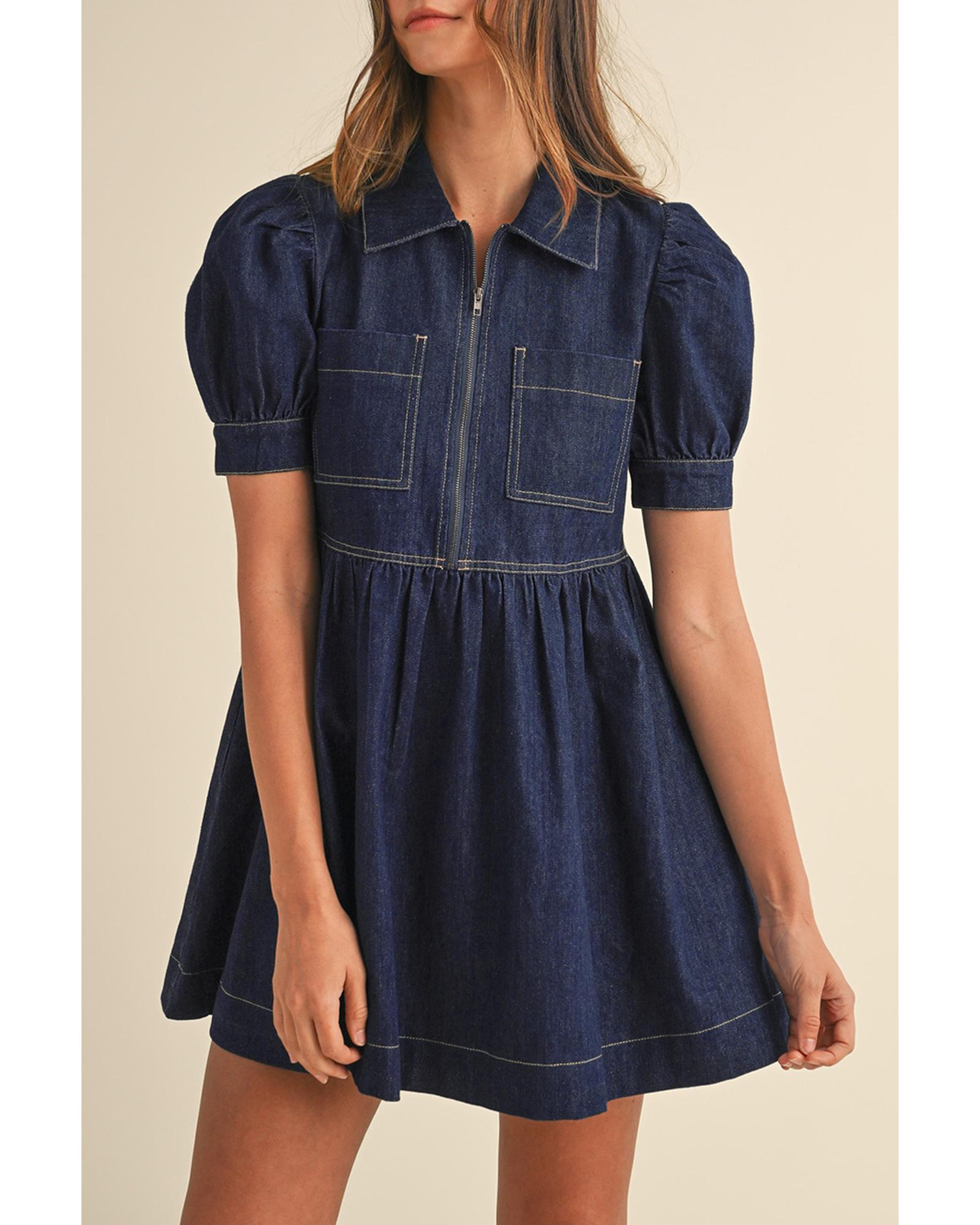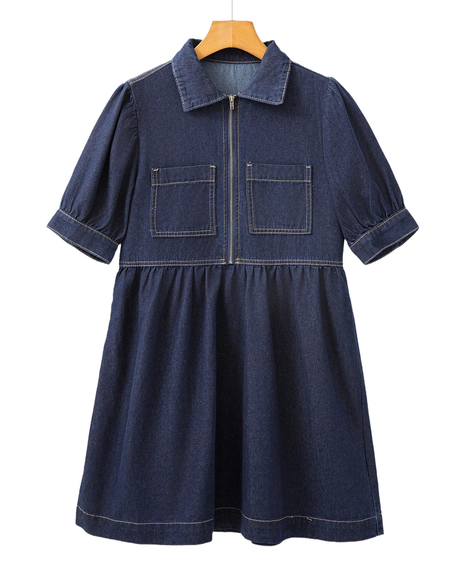 Dirty blue Zipped up Bodice Collared Short Puff Sleeve Denim Dress – L