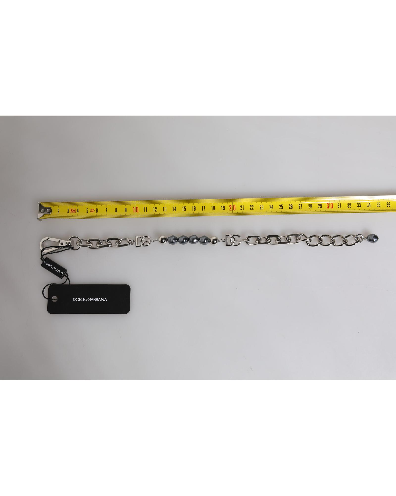 Dolce & Gabbana Men’s Silver Tone Chain Lobster Clasp Logo Gray Pearls Bracelet – One Size