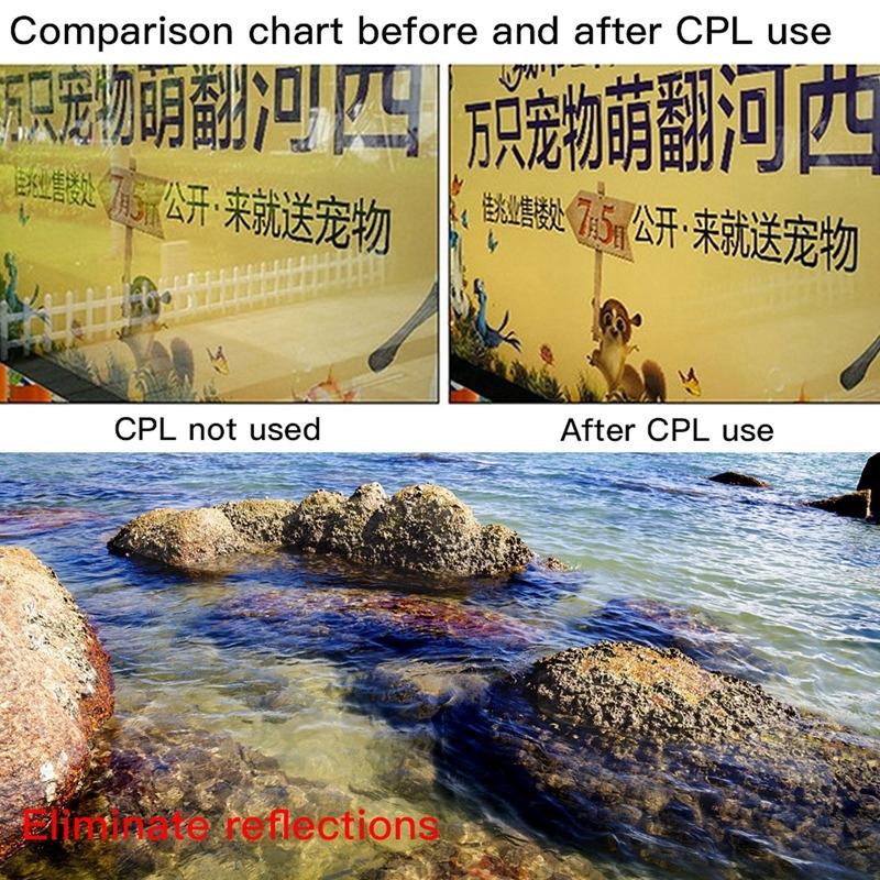 • CPL filters increases colour saturation, creating deep, rich scenic images. Helps to reduce the amount of light entering the lens